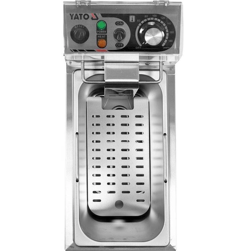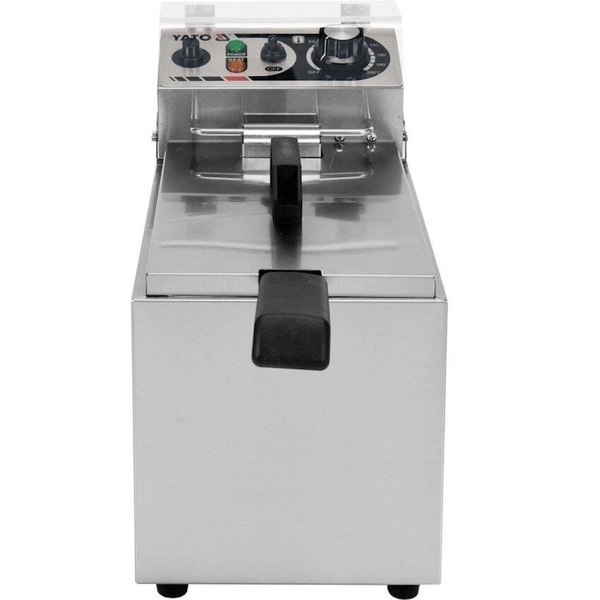 Jednokomorová fritéza o objemu 5L značky YATO. Je určena k fritování v hlubokém oleji: hranolků, masa, ryb, krokety, zeleniny. Nádrž fritézy má celkový plnicí objem 8L. Minimální hladina oleje je 3,2L a maximální 5L.