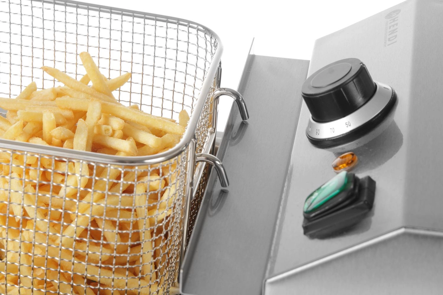 - Vestavěný termostat s kontrolkou – přesná regulace teploty do 195°C a ochrana proti přehřátí zvyšují bezpečnost obsluhy a umožňují dosažení dokonalých výsledků smažení.