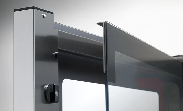 - Dvojitě prosklené dveře s chlazením – dveře vybavené gravitačním chlazením a snadno otevíratelným sklem zajišťují bezpečnost a komfort práce, minimalizují riziko popálení a usnadňují udržování čistoty.