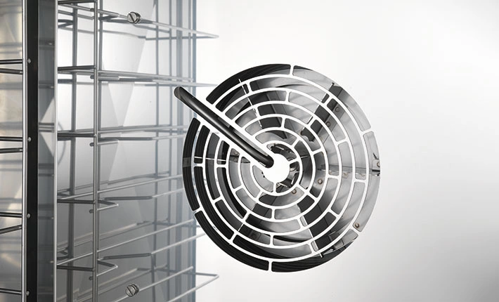 - Tři ventilátory s autoreverzem – zajišťují rovnoměrnou cirkulaci vzduchu, což vede k jednotným výsledkům pečení na každé úrovni komory, i při plném zatížení.