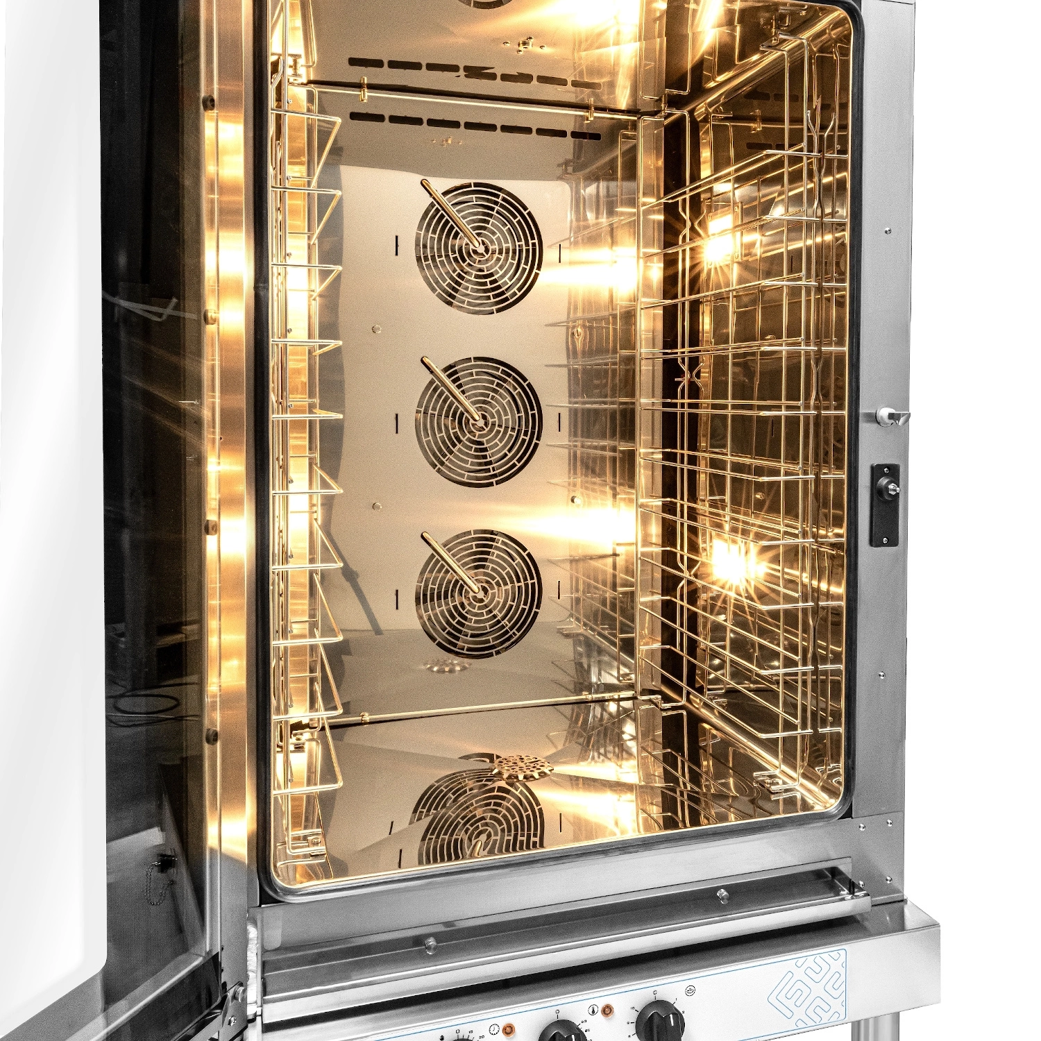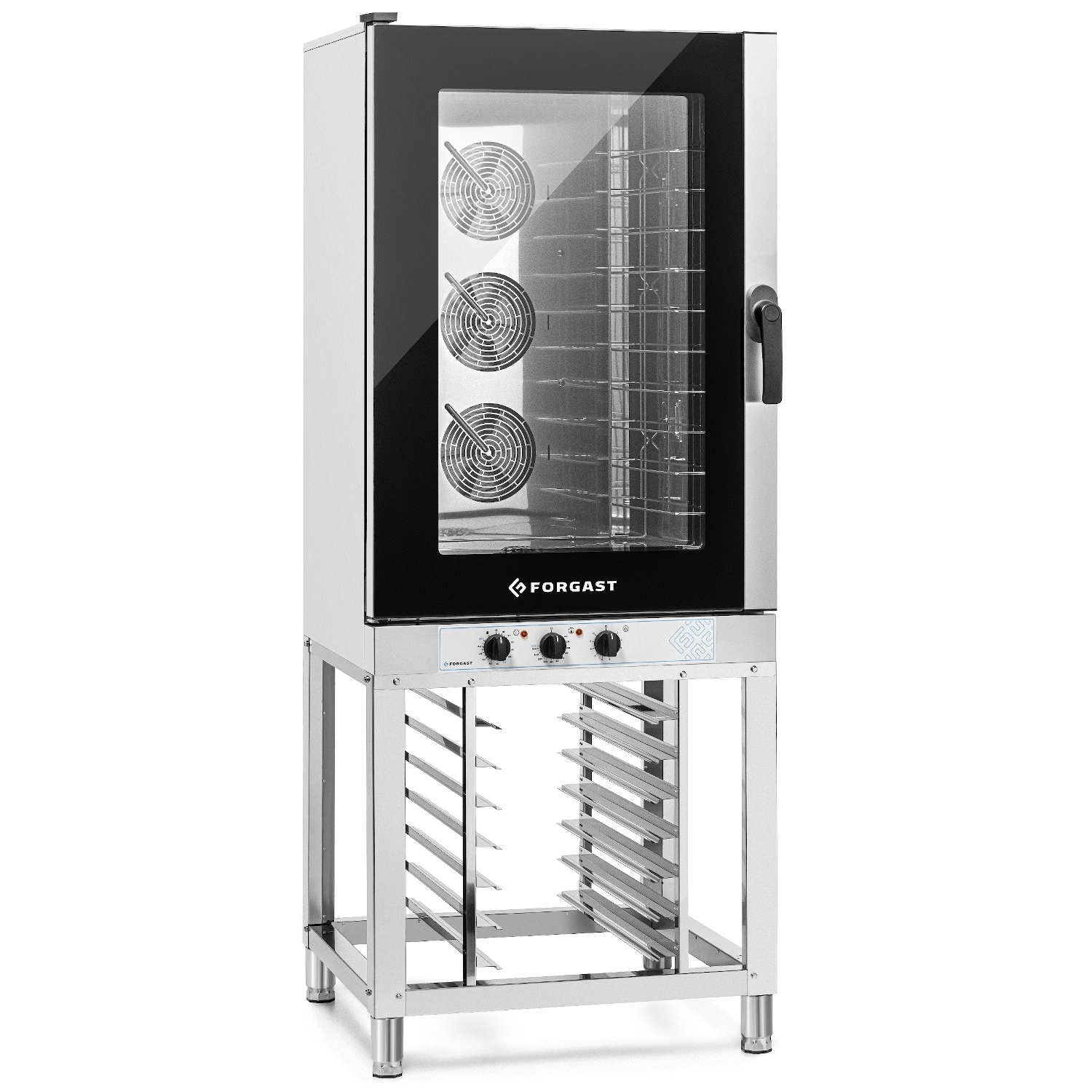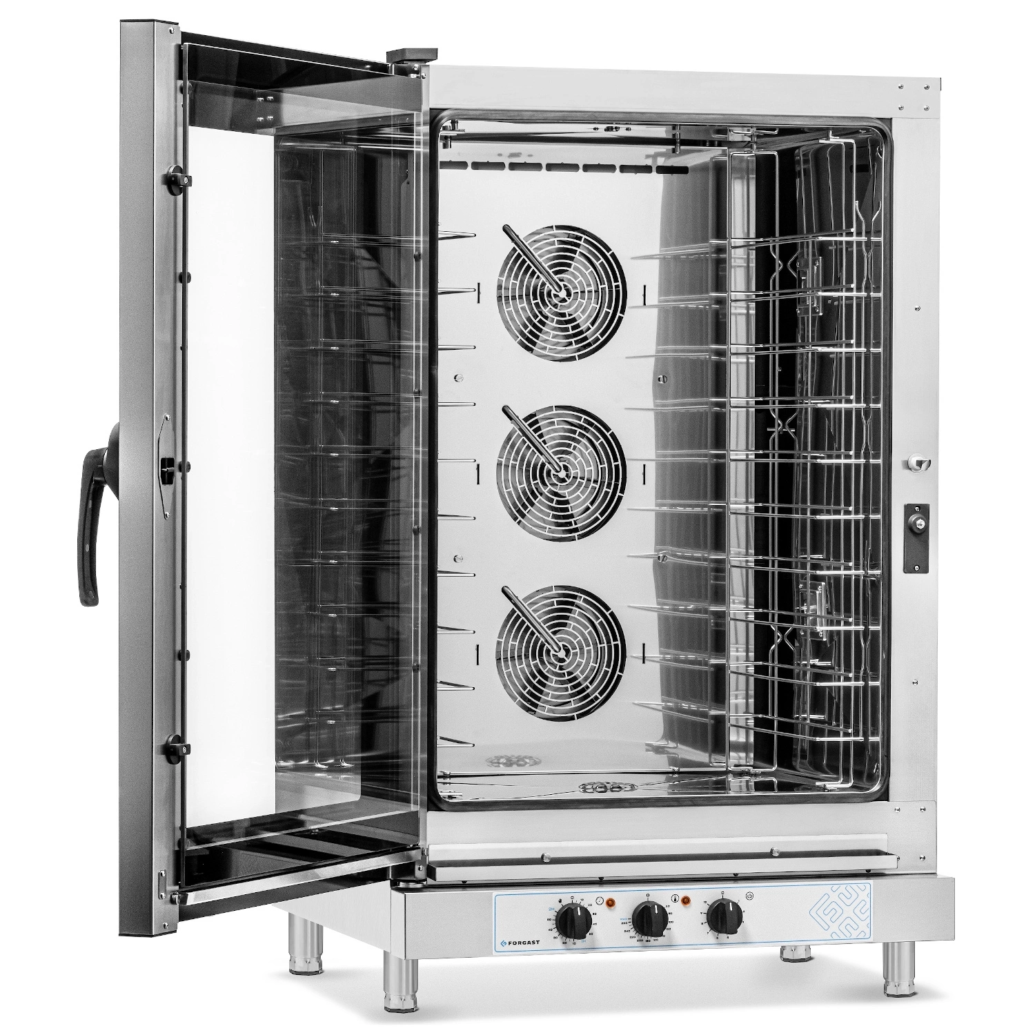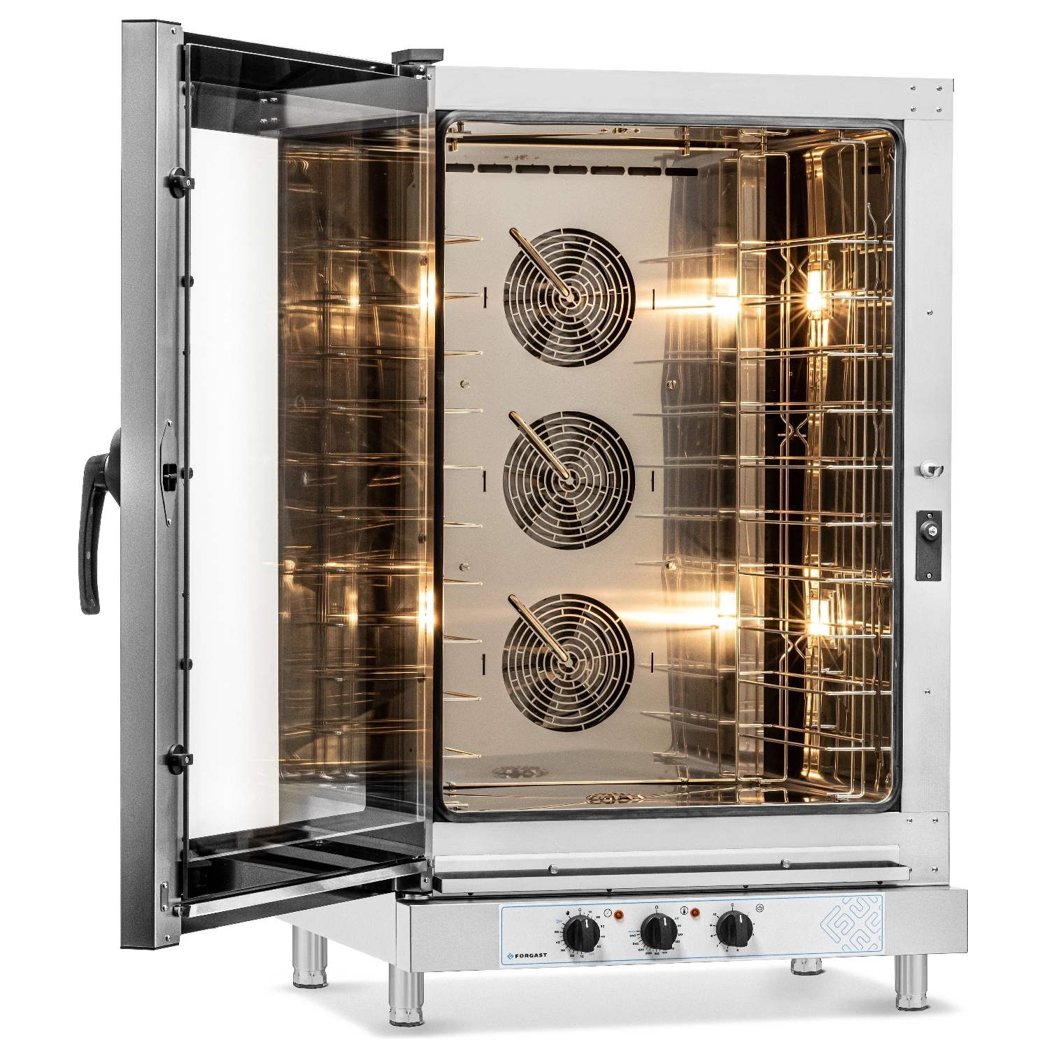 Elektrická konvektomata s parou FORGAST FG09520 je profesionální zařízení určené pro gastronomii, pekárny a cukrárny. Jeho největšími přednostmi jsou vysoká kapacita na 10 gastronádob GN 1/1 nebo 10 plechů 60x40 cm a univerzálnost použití – od vaření v páře, přes pečení až po grilování. Tento model je ideální tam, kde záleží na rychlosti, efektivitě a rovnoměrných tepelných výsledcích.