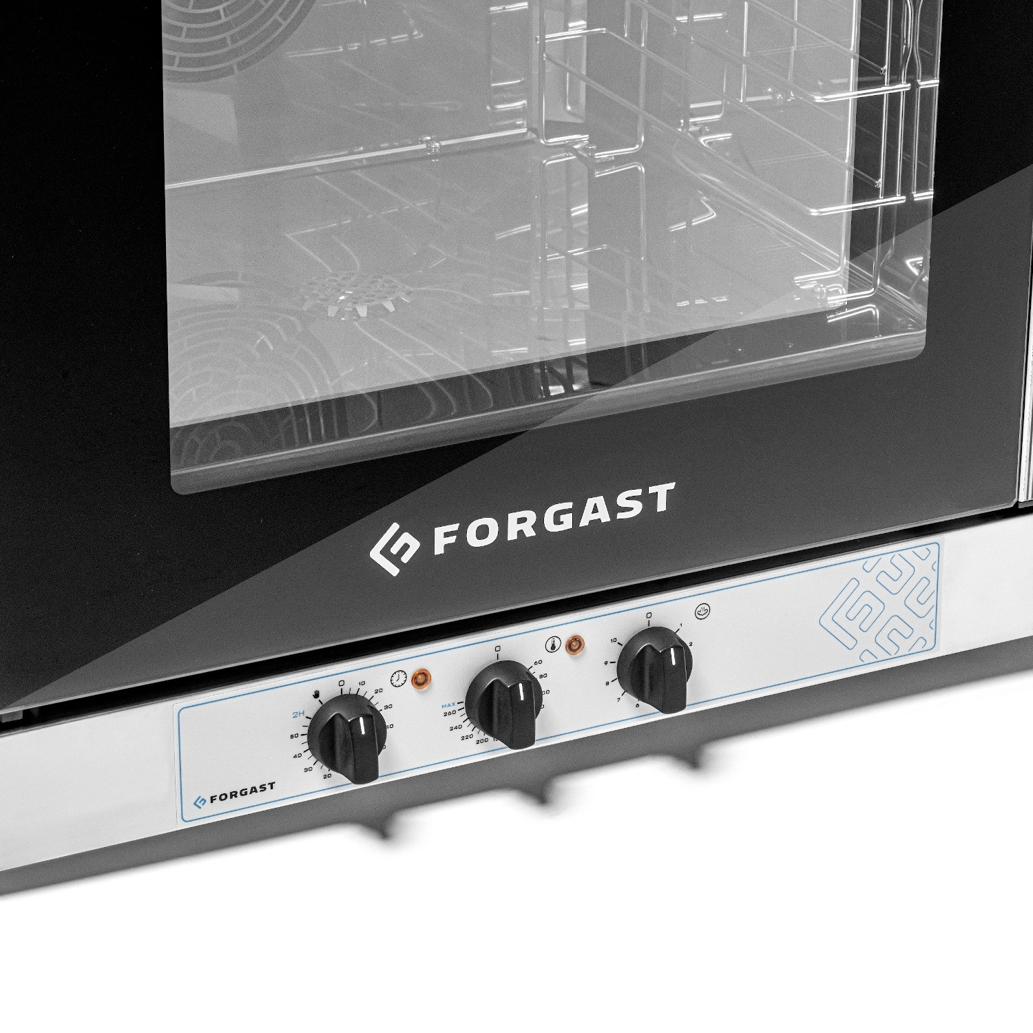 Trouba FORGAST FG09520 byla navržena s ohledem na pohodlí a bezpečnost uživatele. Plášť i vnitřek jsou vyrobeny z vysoce kvalitní nerezové oceli, což zajišťuje snadné udržování hygieny a dlouhou životnost zařízení. Dveře s dvojitým sklem umožňují neustálou kontrolu pečícího procesu bez nutnosti otevírání komory, což zabraňuje úniku tepla. Ergonomická klika na pravé straně usnadňuje obsluhu i při zvýšeném provozu v kuchyni a halogenové osvětlení vnitřku zaručuje vynikající viditelnost na všech úrovních. Systém tří ventilátorů s reverzací otáček zajišťuje rovnoměrné rozložení tepla a eliminuje riziko nedopečených pokrmů.