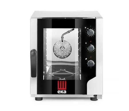 Evolution Nový kombinovaný parní stroj 5xGN 2/3. Ruční ovládání, možnost nastavení: teploty, doby pečení a stupně napařování. Výroba páry probíhá přímým rozstřikem vody na ventilátor. 5 stupňů regulace páry v rozsahu 0-100 %. Teplotní rozsah 100-270oC. Teplota uvnitř komory je řízena termostatem. Vyjímatelné vodicí lišty pro GN nádoby a žáruvzdorné okno s dvojitým sklem a těsněním. Spotřebič je vybaven kontrolkami různých funkcí a časovačem na 0-120 minut. Komora trouby je vyrobena z vysoce kvalitní nerezové oceli AISI 304.