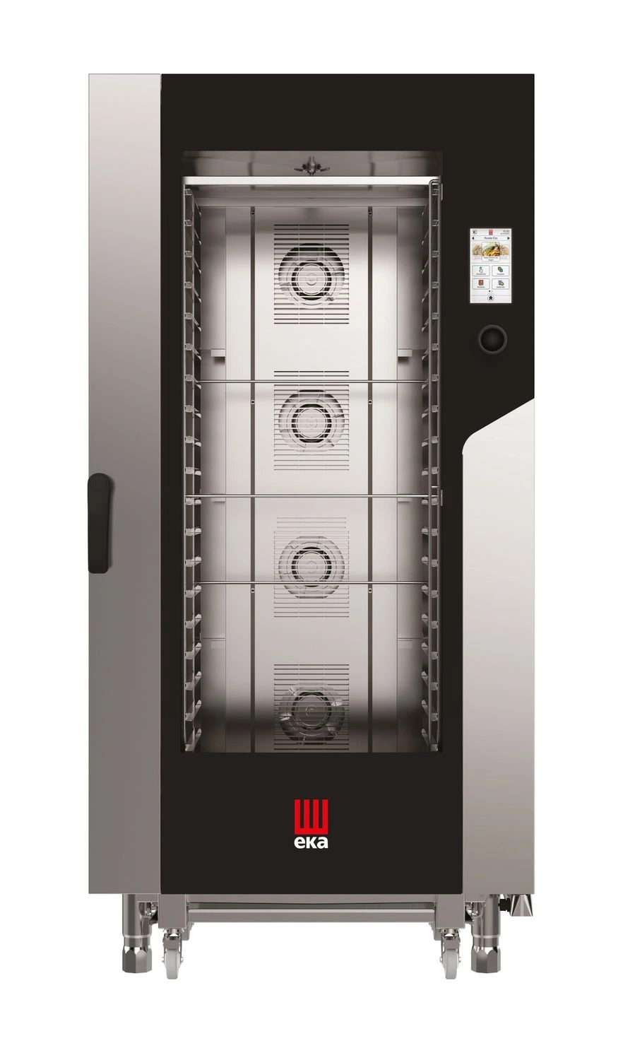 Elektrická kombinovaná parní trouba Gastro s dotykovou obrazovkou Millenial. Je vhodná až pro 20 plechů GN 1/1. Trouba má 7palcový barevný a dotykový ovládací panel, který umožňuje přesné nastavení parametrů pečení. Funkce Airflowlogic je řešení, které díky přepracovanému designu odsavače zlepšilo cirkulaci vzduchu ventilátorem. Humilogic je nový zvlhčovací systém, který přivádí vodu přímo z ventilátoru. Tím je zajištěna vysoká úroveň vlhkosti, která snižuje spotřebu vody. Drylogic je rovněž inovativní systém. Ventilór řízený počítačem kontroluje výměnu vzduchu v komoře a odstraňuje nadměrnou vlhkost. Teplota uvnitř vařeného výrobku se měří pomocí bodové sondy. Víceúrovňové vaření umožňuje současnou přípravu různých pokrmů vyžadujících stejné podmínky, ale různou dobu vaření. Trouba vás informuje o tom, kdy je třeba pokrm vyjmout. Předehřev zahřeje komoru trouby na 30 stupňů, zatímco funkce Cooldown komoru ochladí, aby bylo možné zahájit další proces vaření. Systém čištění je automatický se 4 programy čištění: Eco, Normal, Intensive, Rinse. Nádoba USB usnadňuje nahrávání nových kuchařských receptů a údajů HACCP. Ideálně funguje také jako rozmnožovací komora a banketka. Kuchařka pojme až 500 receptóů po 10 krocích. Regulace teploty od 30 stupňů;C-270 stupňů;C.