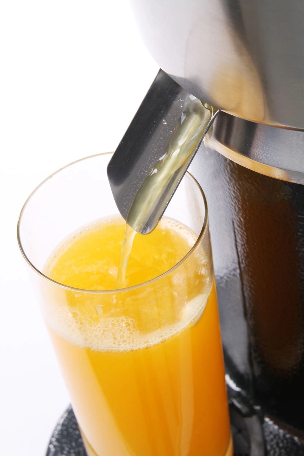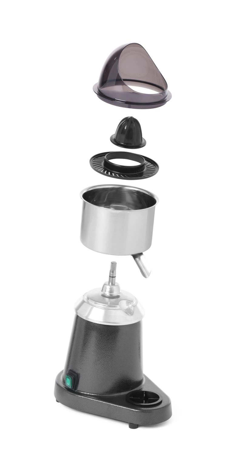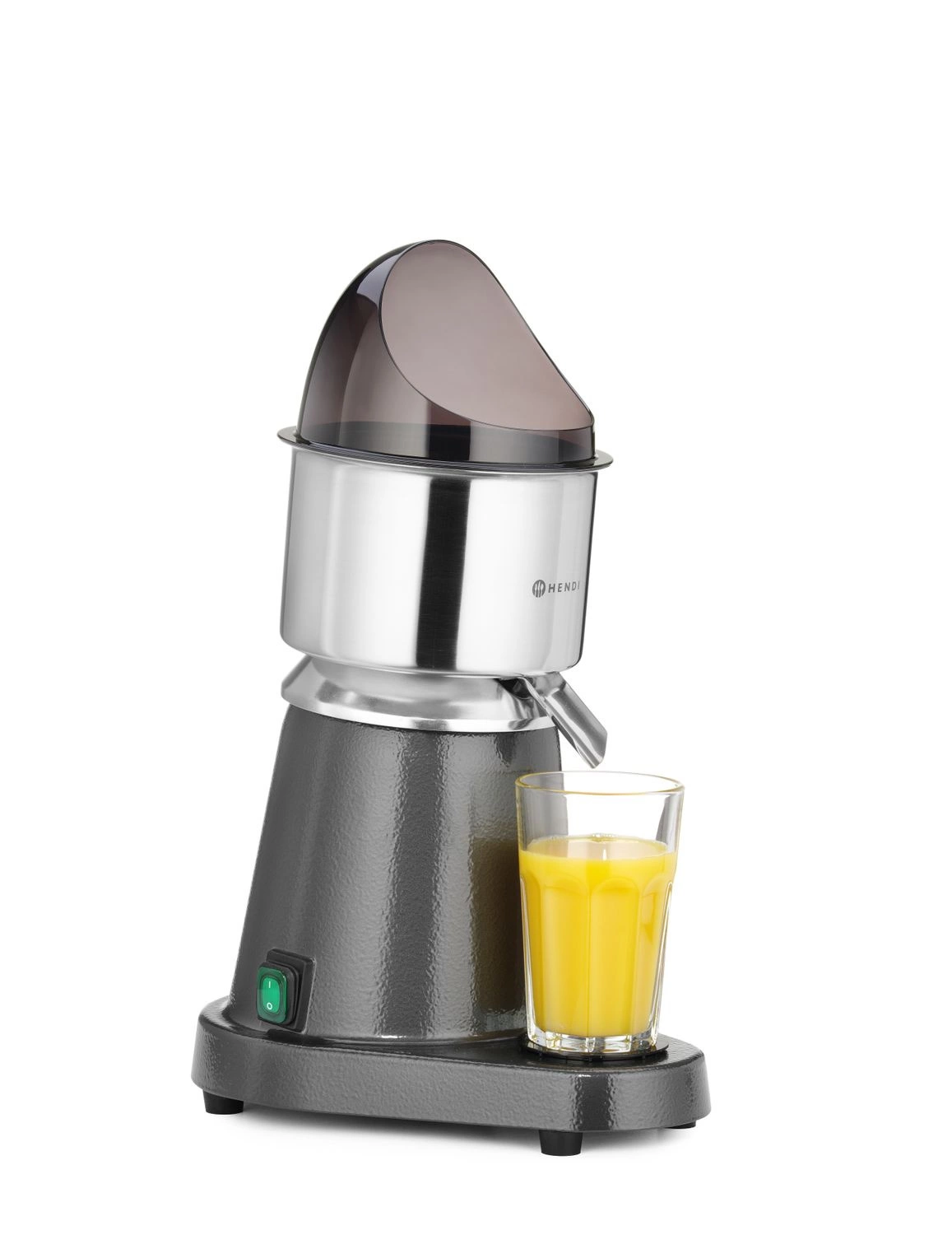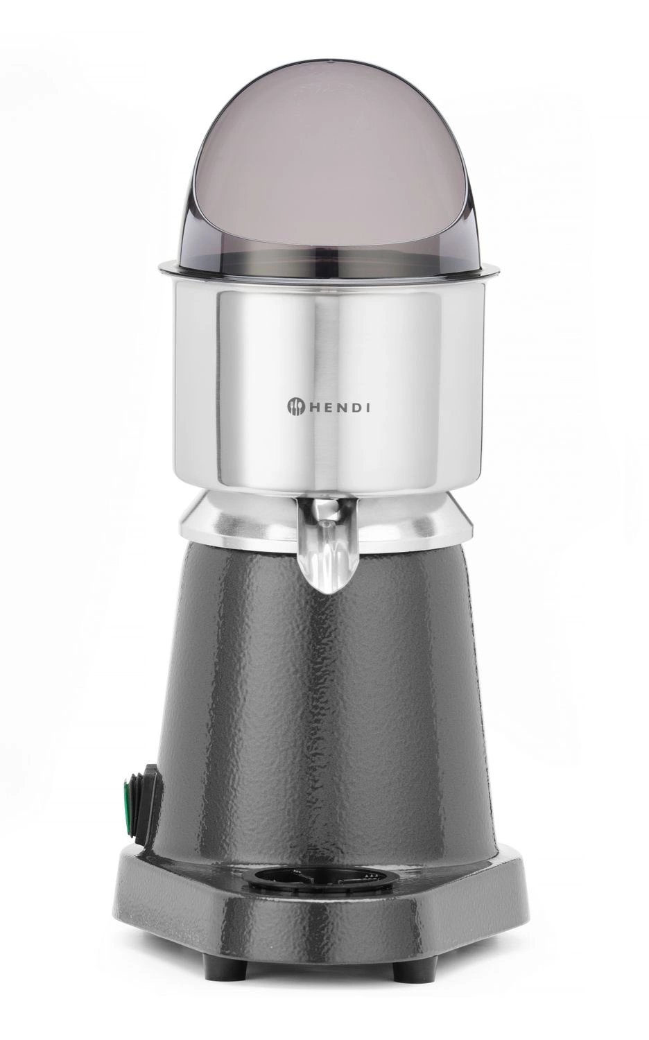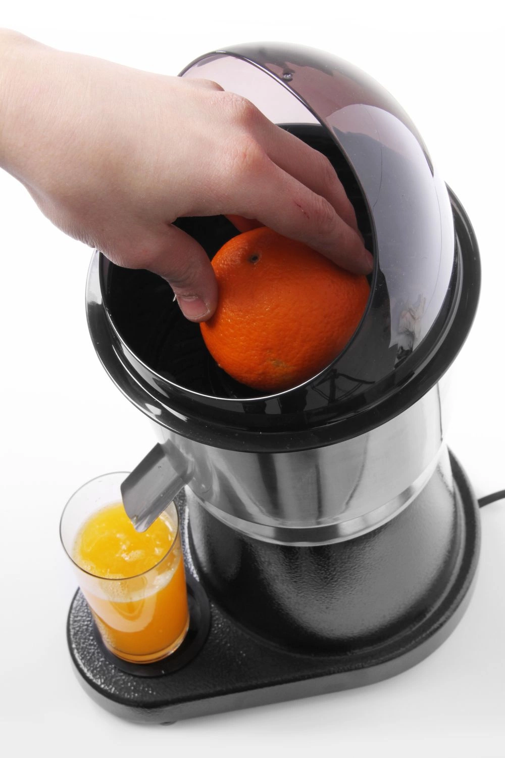 Elektrický lis na citrusové plody. . Kryt přístroje je vyroben z nerezavějícího materiálu, zatímco pracovní část (nádoba) je vyrobena z nerezové oceli. Obsahuje 3 plastové stiskací podložky. Obrazovka z plastu. Extruder se snadno používá. Ovládání pomocí tlačítka zapnutí/vypnutí. Ochrana proti stříkající vodě.