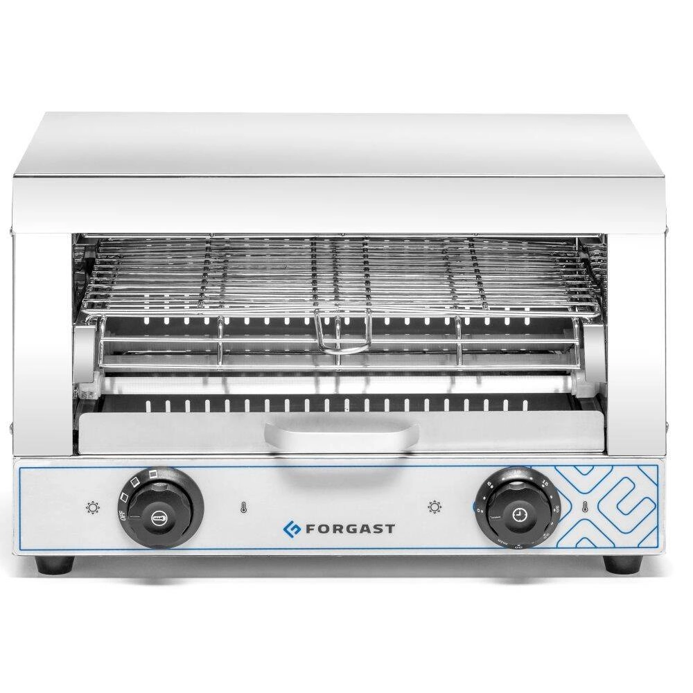 Elektrický opékač FORGAST FG09208 byl navržen s ohledem na profesionální použití. Je kompletně vyroben z nerezové oceli, je odolný vůči intenzivnímu používání a snadno se udržuje v čistotě. Vnitřek opékače pojme jeden rošt, který umožňuje současnou přípravu několika produktů. Časovač s možností nastavení až na 30 minut umožňuje přesné kontrolování doby opékání a eliminuje riziko spálení pokrmů. Díky možnosti volby provozu topných těles (horní, dolní nebo obě), je zařízení vhodné jak pro jemné ohřívání, tak pro rychlé opékání.