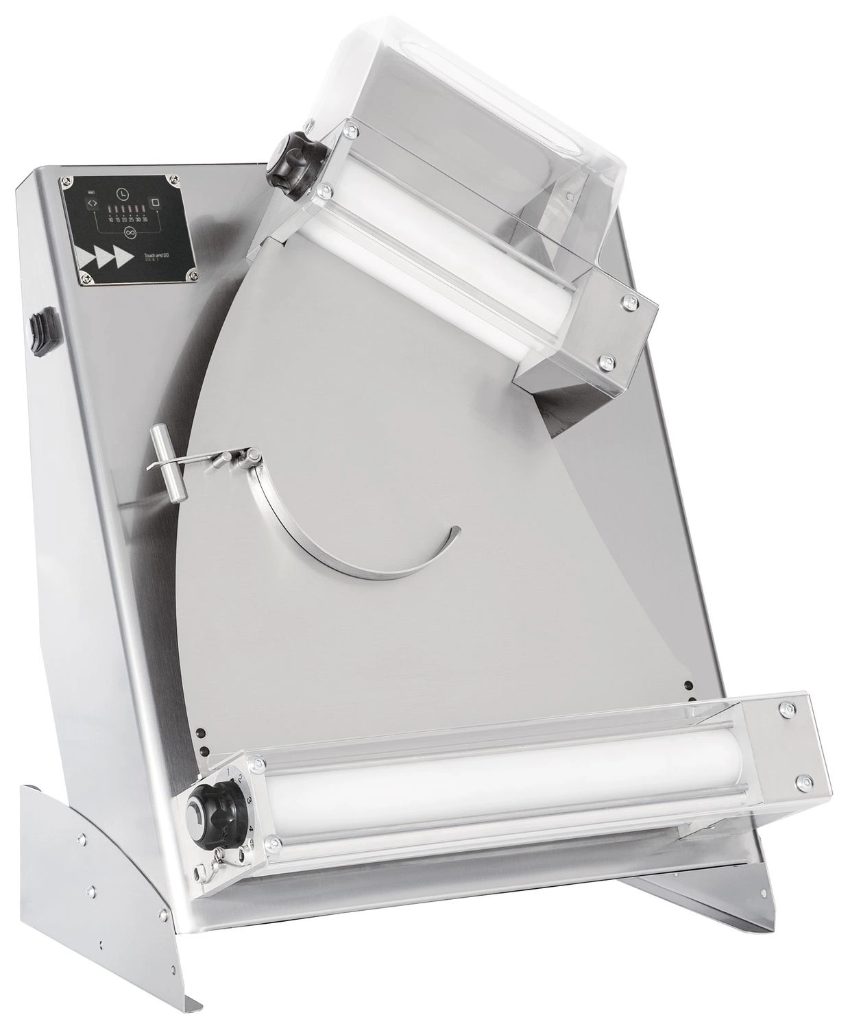 Dva páry nastavitelných válečkůóumožňují nastavit požadovanou tloušťku těsta. Váleček umožňuje získat těsto o rovnoměrné hmotnosti a průměru. Lze tvarovat pizzy o průměru od 14 do 30 cm. Štíty na válečcích zajišťují bezpečnou obsluhu.
