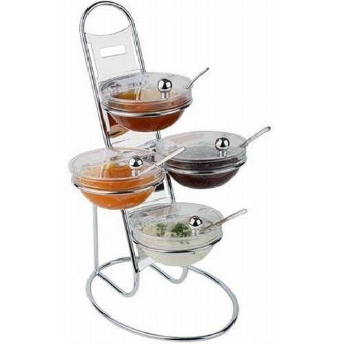 Bufetový žebřík je vyroben z pevných chromovaných prvků, které zajišťují stabilitu a elegantní vzhled. Součástí balení jsou skleněné misky o objemu 0,5 litru každá, vybavené praktickými výklopnými víčky s místem pro popis obsahu. Celek je navržen s ohledem na snadné používání a údržbu čistoty.