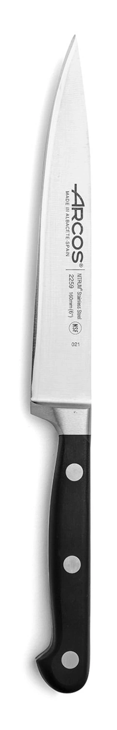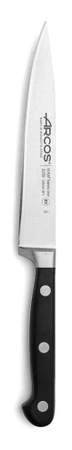 Filetovací nůž ze série ÓPERA od společnosti Arcos je přesný nástroj určený k filetování různých druhů masa a ryb. Tento nůž je vyroben ve Španělsku a vyznačuje se čepelí z inovativní nerezové oceli NITRUM®, která zajišťuje zvýšenou tvrdost a odolnost proti korozi. Díky břitu hedvábného ostří je každý řez mimořádně hladký a přesný a umožňuje snadné a přesné oddělení masa od kosti. Čepel nože je vykovaná z jednoho kusu oceli, což zaručuje její odolnost a stabilitu při používání. Dokonale vyvážená rukojeť z odolného materiálu POM, spojená se střenkou nýty z nerezové oceli, zajišťuje pohodlné držení a snadné používání. Dodatečné profilování chránící prsty zvyšuje bezpečnost při filetování.
