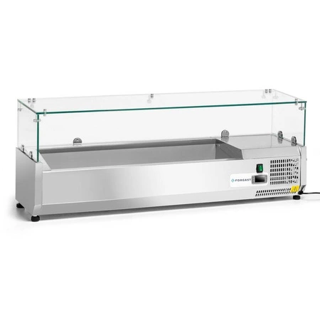 Prosklený chladicí nástavec Forgast 4 GN 1/4 FORGAST FG07225 je profesionální chladicí zařízení, které se vyznačuje moderní konstrukcí a vysokou funkčností. Je vybaven rovnou skleněnou vitrínou a je vyroben z odolné nerezové oceli, což z něj činí ideální řešení pro prezentaci a skladování potravin v chladicích podmínkách. Skvěle se hodí pro gastronomii, zejména pro pizzerie, salátové bary nebo provozovny nabízející čerstvé ingredience.