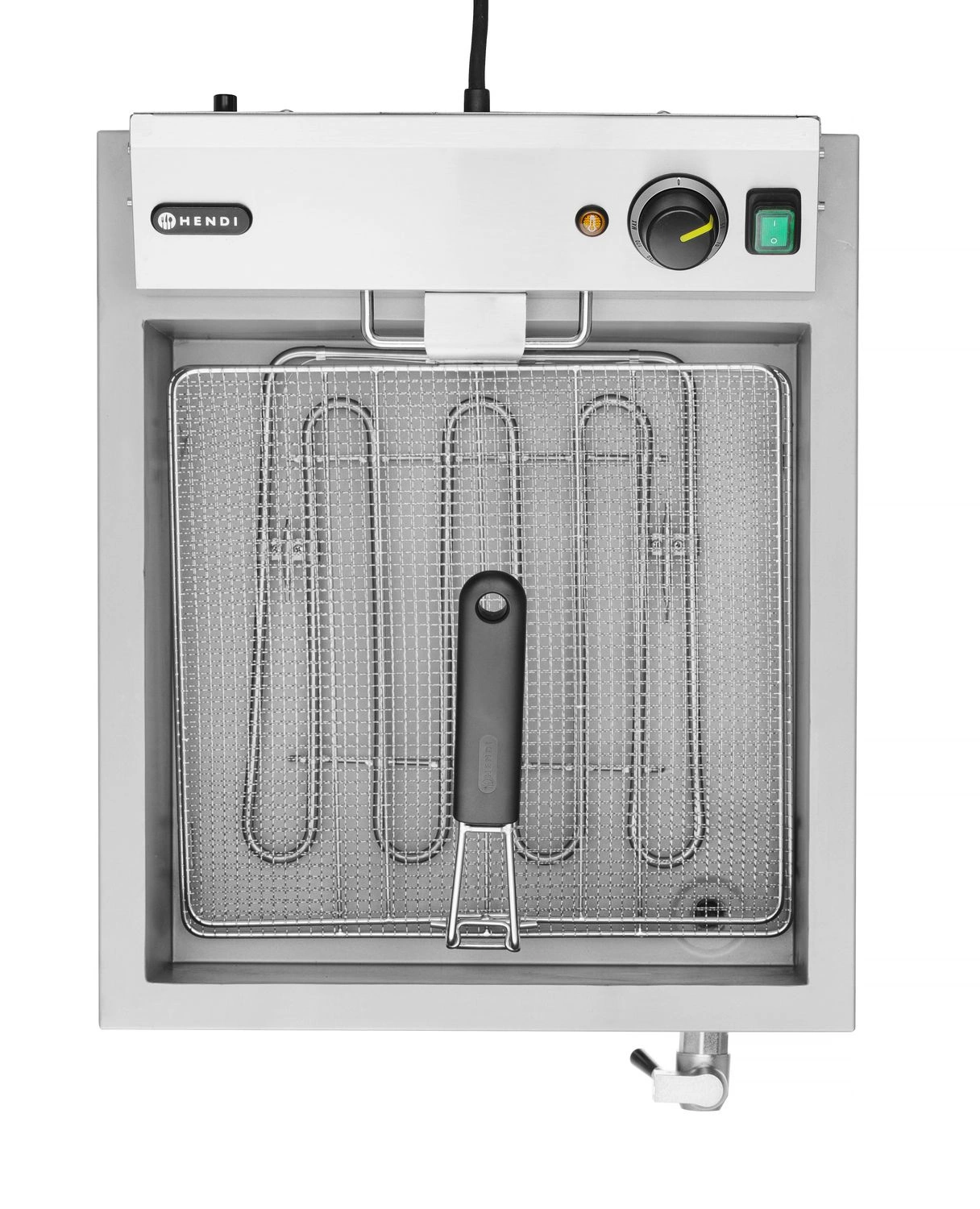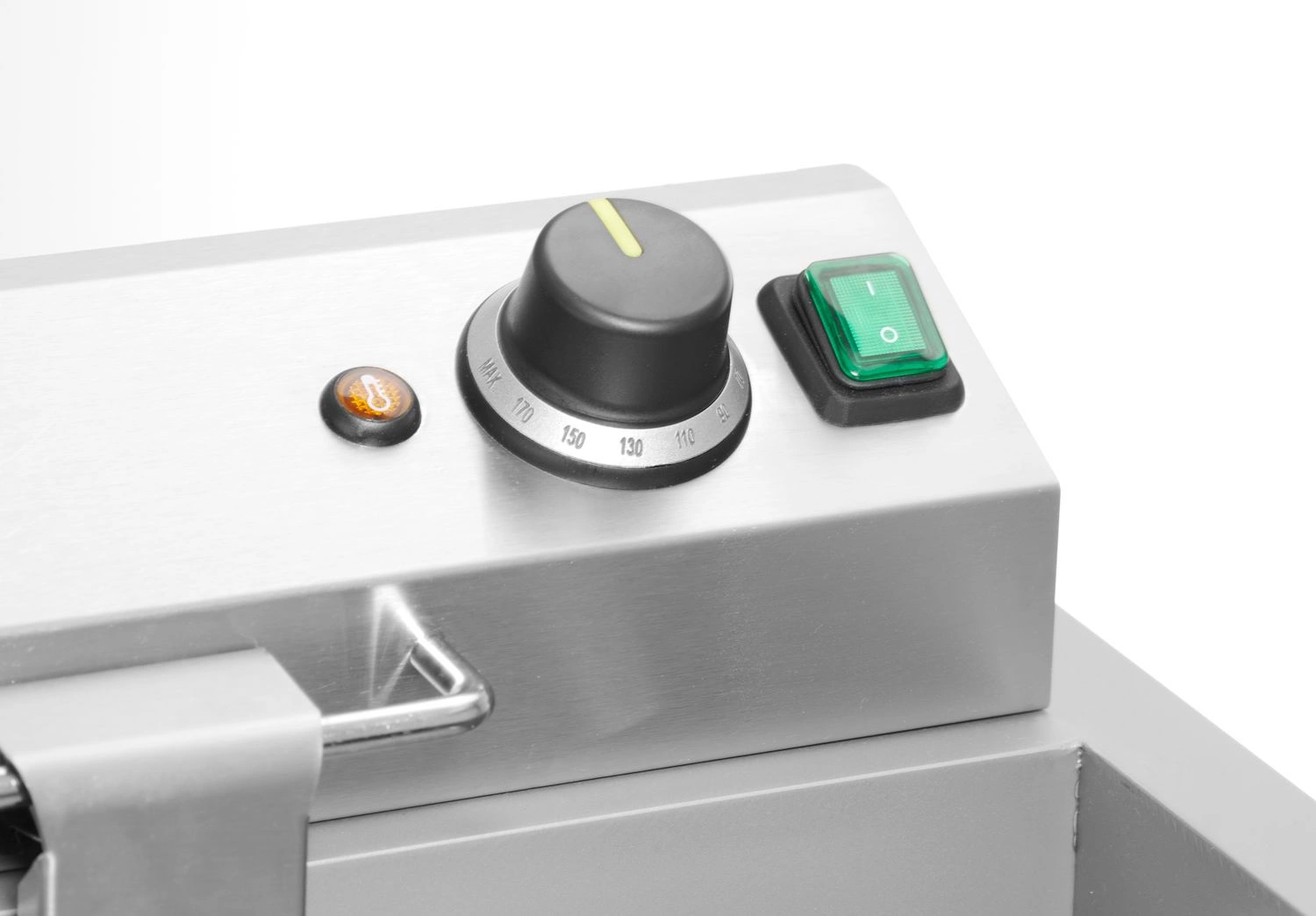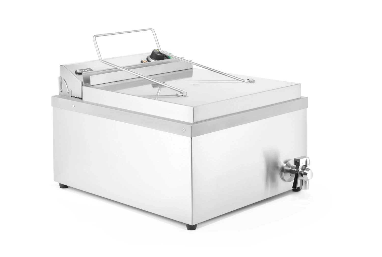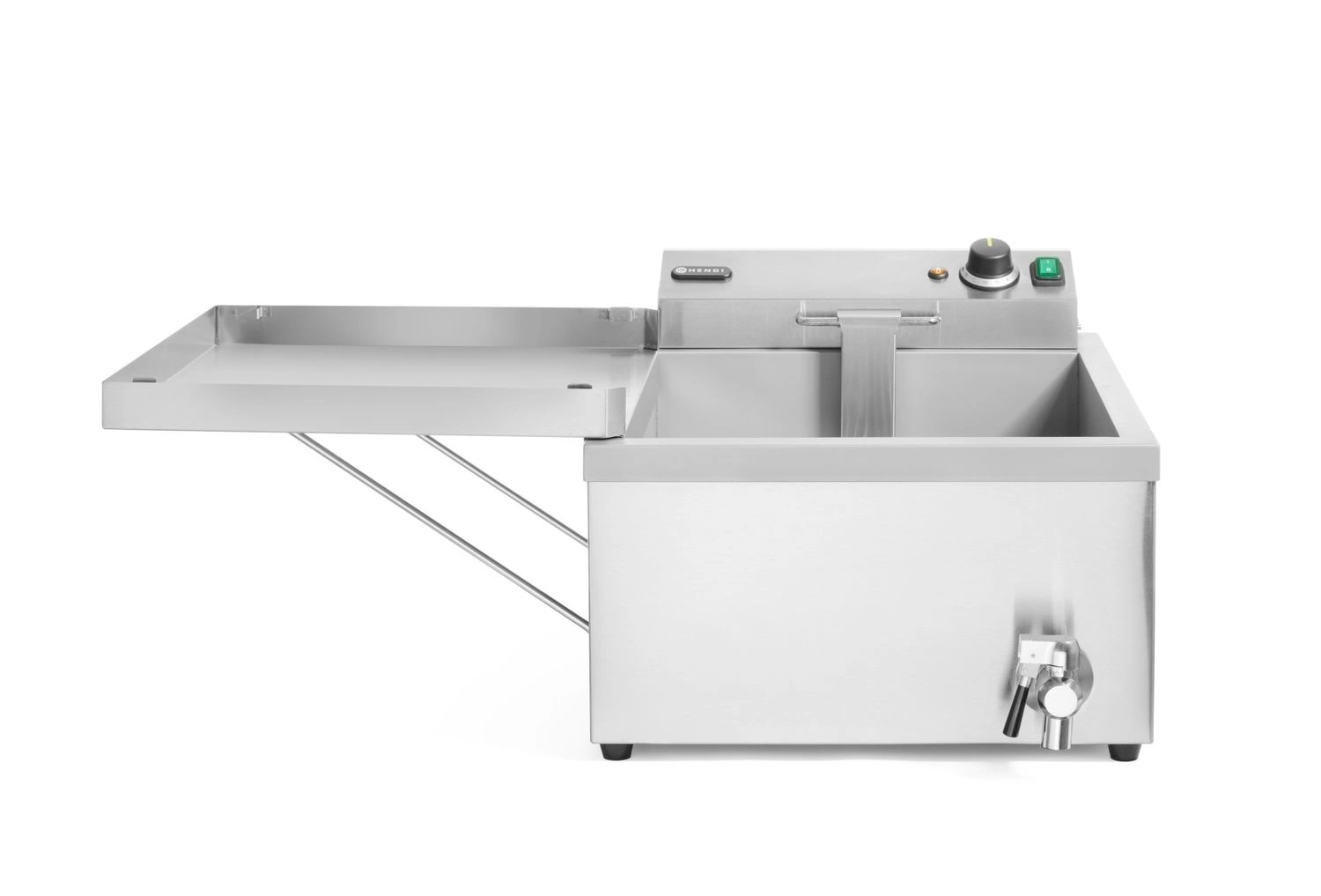 Fritéza na koblihyów od společnosti HENDI. Konstrukce - nerezová ocel, odolná proti korozi a mechanickému poškození. Celkový objem je 12 l. Ideální pro fritování koblih Fawork hranolků, nugetek atd. Regulace teploty od 50 do 190 stupňů;C. Vypouštění oleje ve spodní části komory. Studená zóna. Vypouštěcí kohoutek. Spotřebič má dodatečnou ochranu v podobě odnímatelného ovládacího prvku. Ochrana proti přehřátí.