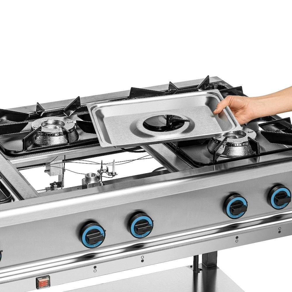 • Různé hořáky: Sporák je vybaven šesti hořáky s různým výkonem, což umožňuje současné vaření, smažení a dušení více pokrmů. Umožňuje to přípravu širokého sortimentu jídel s možností přizpůsobení výkonu potřebám konkrétního jídla.