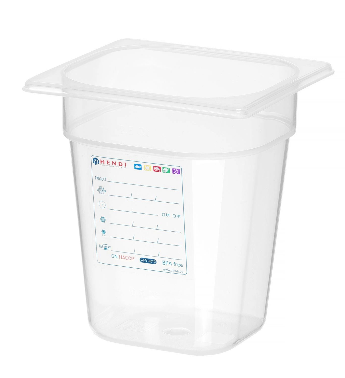 Kontejner GN 1/6 HACCP o hloubce 20 cm z průhledného polypropylenu. Inkrustovaný štítek pro sledování procesu skladování. Nepohlcuje pachyóchutěópříchutě.