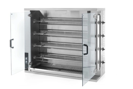 Plynový rožeň pro kuřataós s kapacitou 16/20 kusů. Kryt jednotky z nerezové oceli, výklopná dvířka z tvrzeného skla. Pravé otevírání dveří s částí pravého krytu pro snadné vkládání roštóv. Délka rožně s rukojetí: 950 mm, použitelná délka rožně: 740 mm. Průřez rožně: 12×12 mm. Elektromotor otáčející rožněm: 30 W/230 V. Osvětlení komory.
