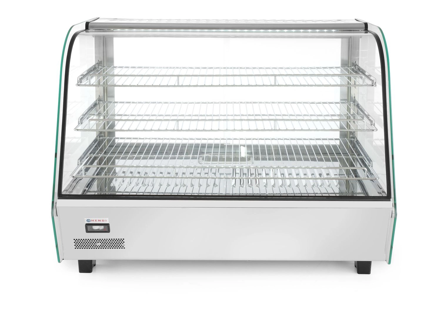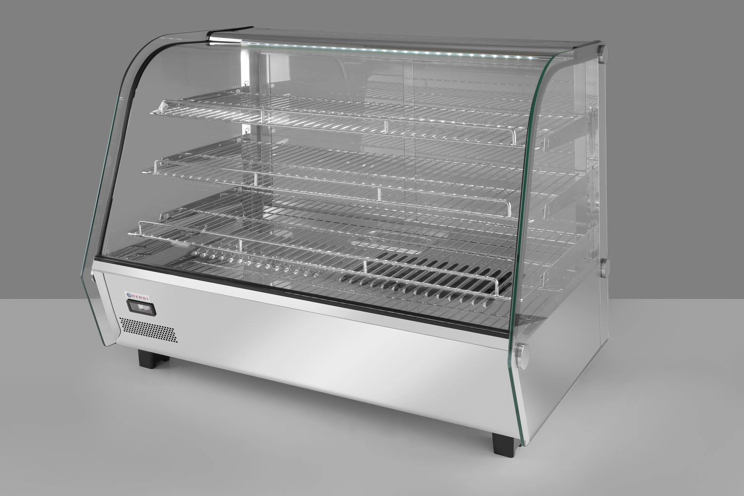 Nastavitelná ohřívací skříň s objemem 160 l S podhledovým, zakřiveným a bezpečnostním sklem. Zadní dvoudílné posuvné dveře. Konstrukce z nerezové oceli. Osvětlení LED Na gór straně přihrádky. 3 chromované a nastavitelné podložky. Knoflík pro regulaci teploty a analogový teploměr.