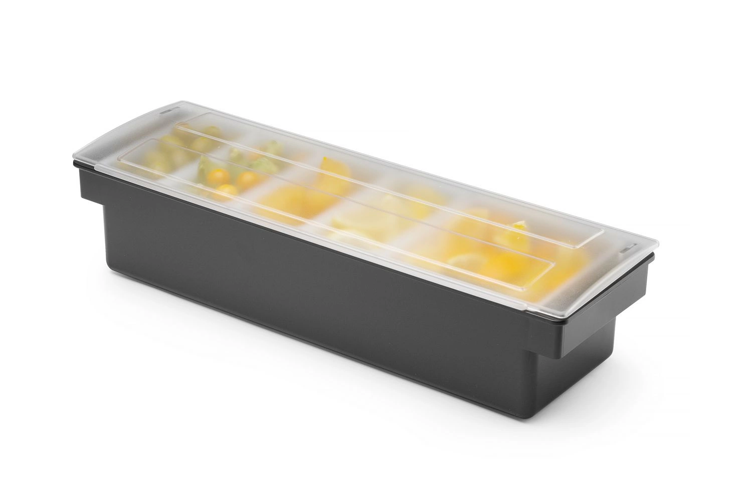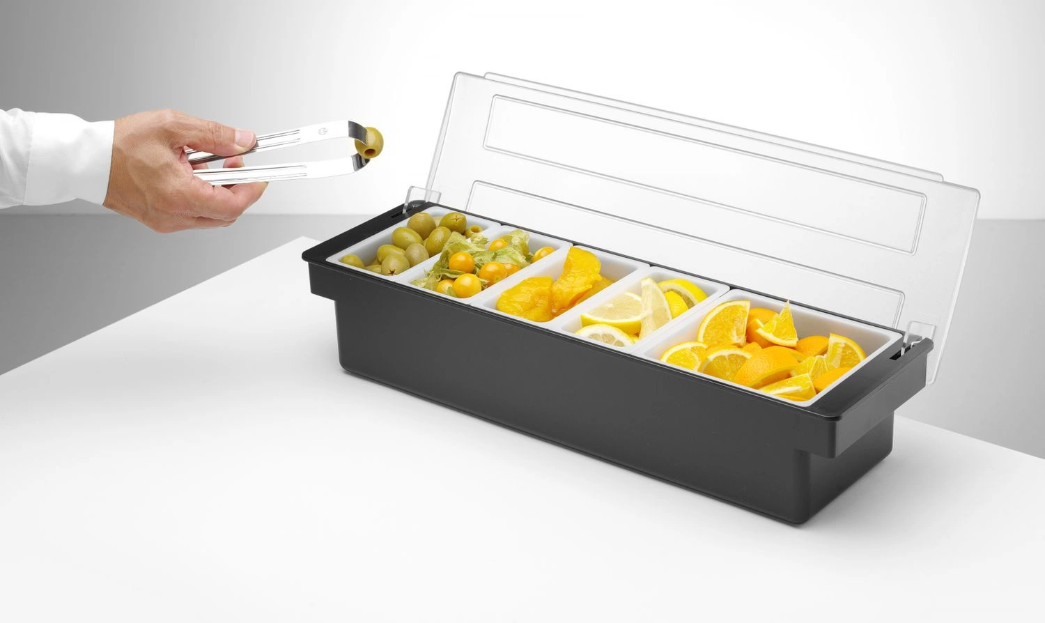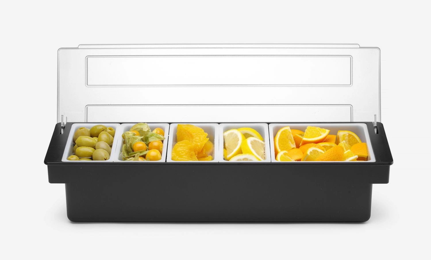 Barmanská nádoba na příslušenství k nápojůmós. Vyrobeno z plastu ABS v černé barvě. Průhledné víko z polykarbonátu. Obsahuje 5 polypropylenových nádobós vložkou.