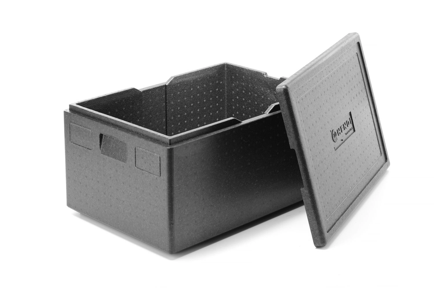 Izolovaný kontejnerMark Hendi. Vyrobeno z černého pyocelanu LSP EB. PNavrženo pro přepravu jídla s ergonomickými rukojeťmi. Má ergonomické rukojeti. Nádoba je určena pro styk s potravinami v podmínkách dlouhodobého chlazení nebo mražení,