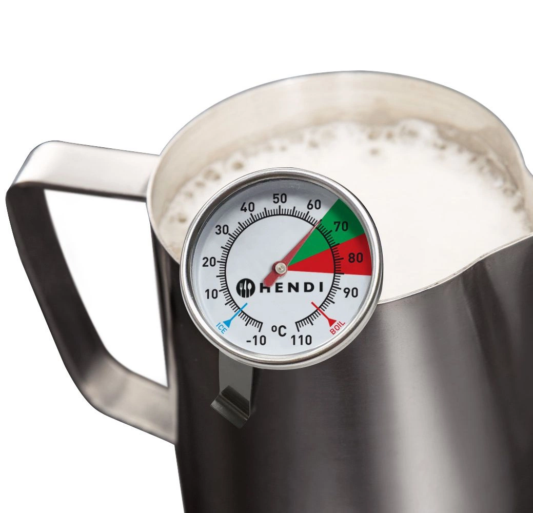 Má klipové upevnění na džbán. Zelené značky označují ideální teplotu napěněného mléka pro cappuccino apod. Teplotní rozsah od -10 stupňů C do +110 stupňů C. Odstupňování po 1 stupni C. Nerezová ocelová sonda, kryt s klipem. Snadno čitelný číselník.