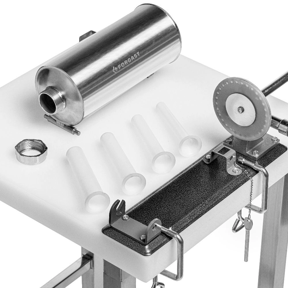 Plnička FORGAST FG10614 má robustní, horizontální konstrukci, která umožňuje pohodlné umístění válce s náplní a snadné plnění střívek. Zařízení je vybaveno čtyřmi plastovými nástavci o průměrech 14, 18, 22 a 26 mm. Díky tomu lze připravit jak tenké klobásky na gril, tak i silnější domácí výrobky. Použití nerezové oceli na krytu a částech, které přicházejí do styku s potravinami, zajišťuje bezpečnost a snadné čištění po skončení práce.
