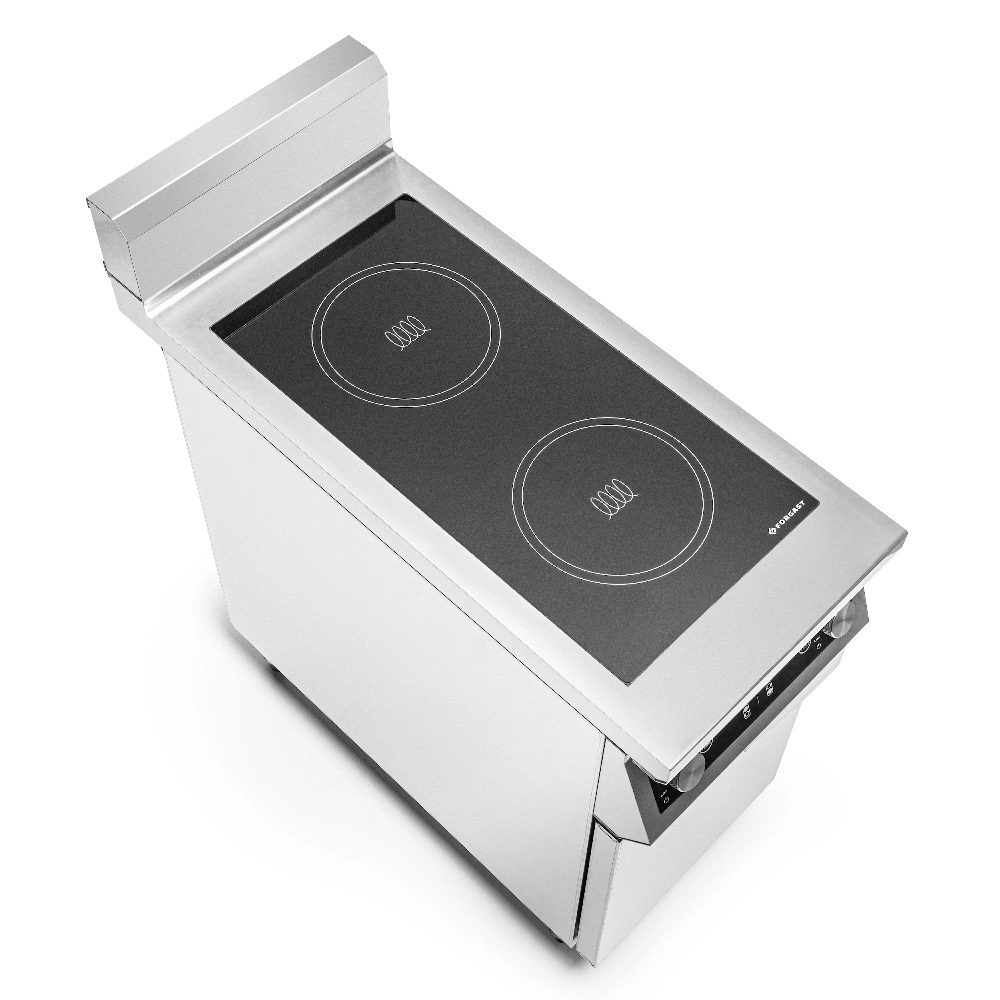 V sadě se nachází indukční sporák se dvěma varnými poli, uzavíratelná skříňka na nádobí a nastavitelné nožičky pro přesné vyrovnání zařízení. Celek je připraven k montáži a okamžitému použití po připojení k napájení 400 V.