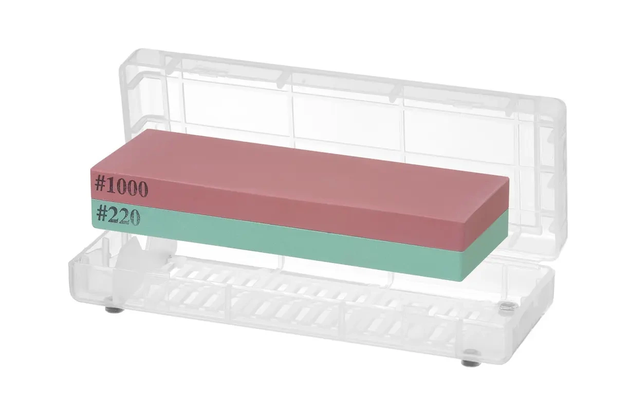 - Oboustranný kámen - kombinuje dvě desky různé zrnitosti, 220: pro regeneraci ostří a broušení čepele, 1000: pro základní broušení nožů.