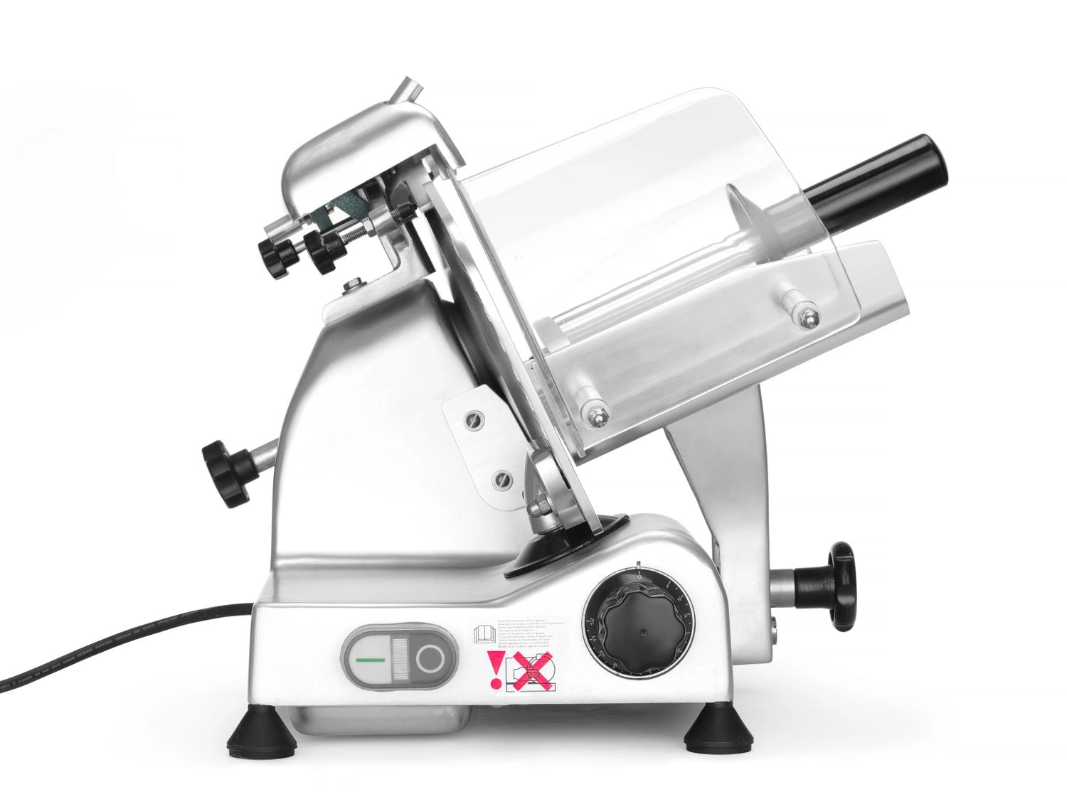 Profesionální kráječ na uzeniny a maso, určený pro intenzivní provoz v gastronomii, potravinářských obchodech nebo masnách. Zařízení se vyznačuje robustní hliníkovou konstrukcí, nožem z nerezové oceli o průměru 22 cm a širokým rozsahem nastavení tloušťky řezu od tenkých plátků až po 12 mm.