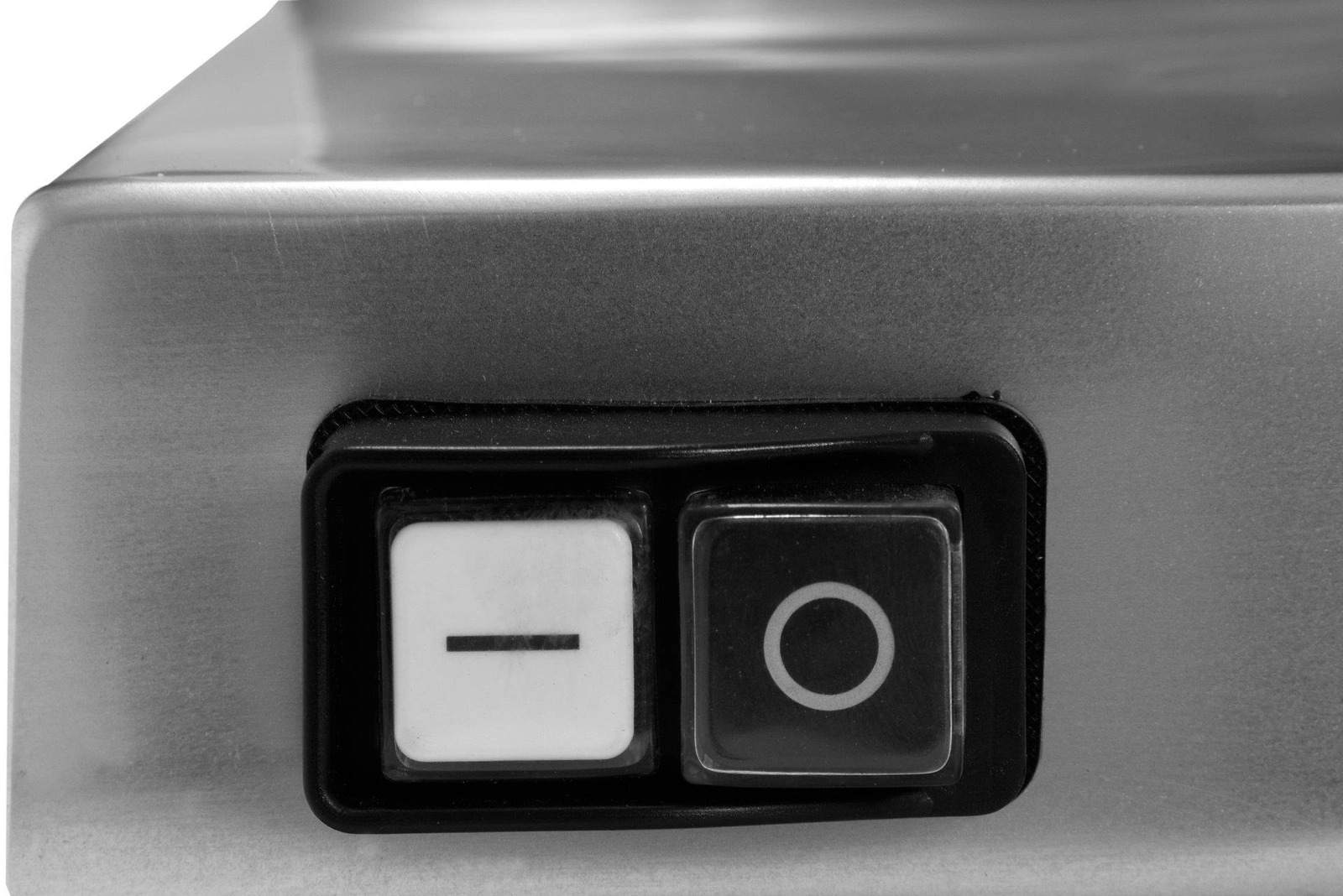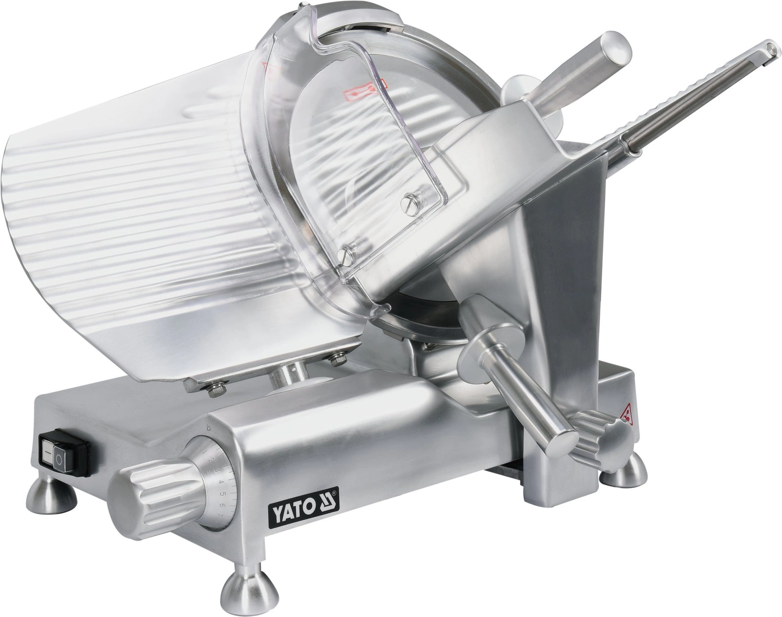 Kráječ na klobásy značky YATO s průměrem nože 30 cm. Základna kráječe z vysoce kvalitní hliníkové slitiny s šedě lakovaným povrchem usnadňuje udržování čistoty. Odnímatelný wózek navíc usnadňuje přístup do těžko přístupných míst a umožňuje důkladné vyčištění stroje od zbytků krájených produktů. Řezný kotouč o průměru 30 cm Umožňuje přesné krájení výrobků o průměru až do 10 mm 20 cm. . Díky plynulé regulaci tloušťky plátků je možné získat plátky o tloušťce 0,2 až 15 mm, čímž se přizpůsobí rozmanitým potřebám kuchyně. Maximální šířka krájeného výrobku je 18 cm, zatímco maximální průměr krájeného výrobku je 20 cm. Vzduchem chlazený motor s výkonem 250 W nejen zabraňuje přetížení, ale také zaručuje vysoký výkon a dlouhou životnost stroje. Wózek uložený na vodicích drahách s ložisky má lehký a hladký chod, což výrazně snižuje námahu při řezání. Navíc zkosené umístění řezacího mechanismu umožňuje gravitační přitlačení krájených výrobkůót na kotouč, což dále zlepšuje proces.