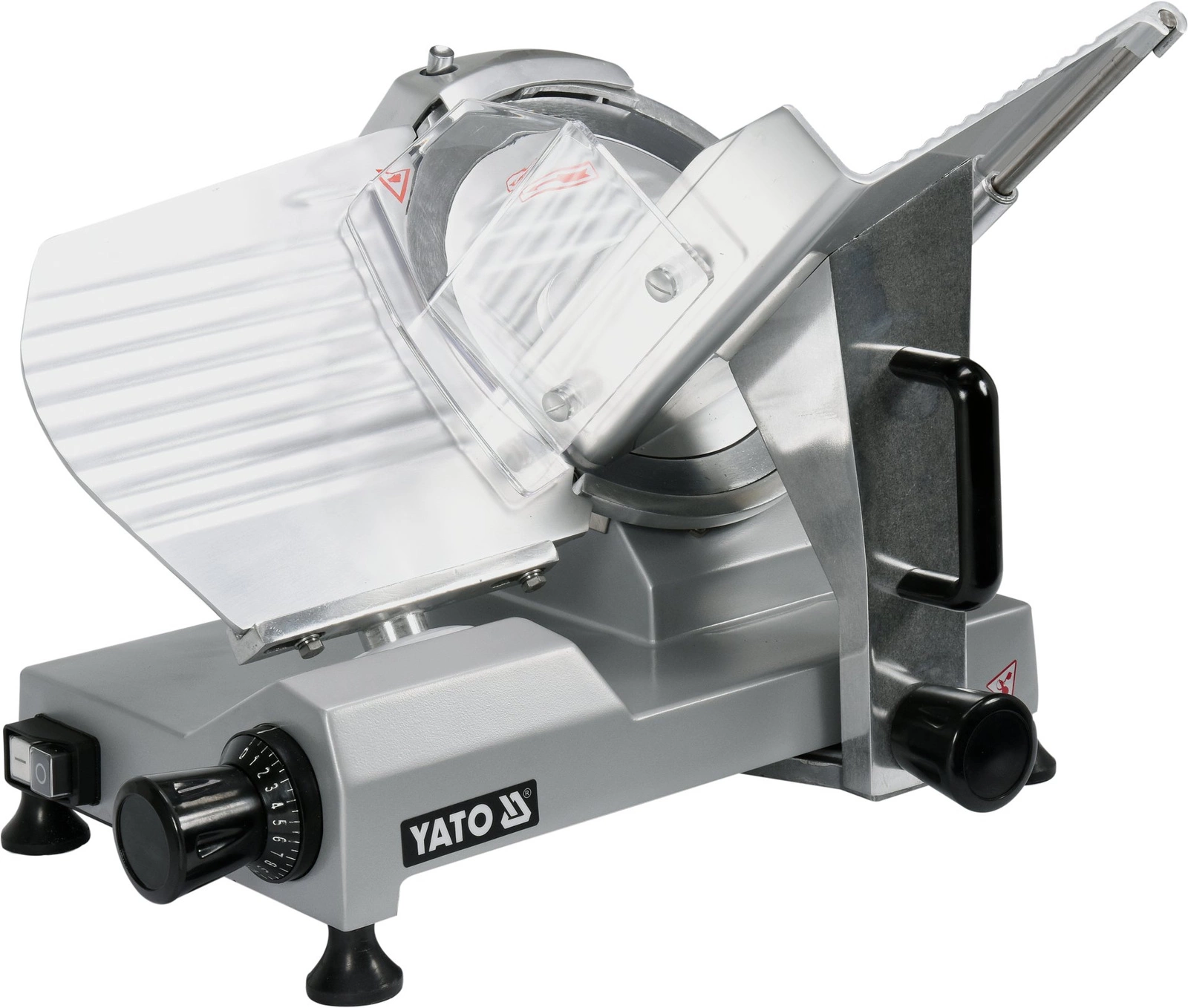 Kráječ na klobásy značky YATO s průměrem nože 22 cm. Základna kráječe z vysoce kvalitní hliníkové slitiny s šedě lakovaným povrchem usnadňuje udržování čistoty. Odnímatelný wózek navíc usnadňuje přístup do těžko přístupných míst a umožňuje důkladné vyčištění stroje od zbytků krájených produktů. Řezný kotouč o průměru 22 cm umožňuje přesné krájení výrobkůóly až do průměru 15 cm. Díky plynulému nastavení tloušťky plátků je možné získat plátky o tloušťce od 0,2 do 12 mm, čímž se přizpůsobí různorodým potřebám kuchyně. Vzduchem chlazený motor o příkonu 120 W nejenže zabraňuje přetížení, ale také zaručuje vysoký výkon a dlouhou životnost stroje. Wózek uložený na vodítkách s ložisky má lehký a hladký chod, což výrazně snižuje námahu při řezání. Navíc zkosené umístění řezacího mechanismu umožňuje gravitační přitlačení krájených výrobkůót na kotouč, což dále zlepšuje proces.