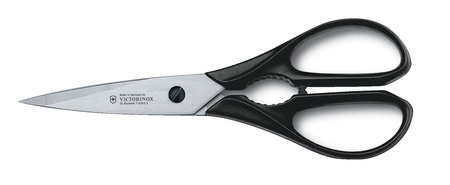 Kuchyňské nůžky s ostřím o délce 20 cm od společnosti Victorinox, multifunkční, užitečné nejen v kuchyni. Čepele nůžek z nerezové oceli mají mikrodrážky pro účinné uchopení stříhaných materiálů, zatímco pevné a praktické rukojeti jsou vyrobeny z mimořádně odolného syntetického materiálu. Nůžky mají také výřez pro otevírání maticóa pevně zašroubovaných sklenicó.