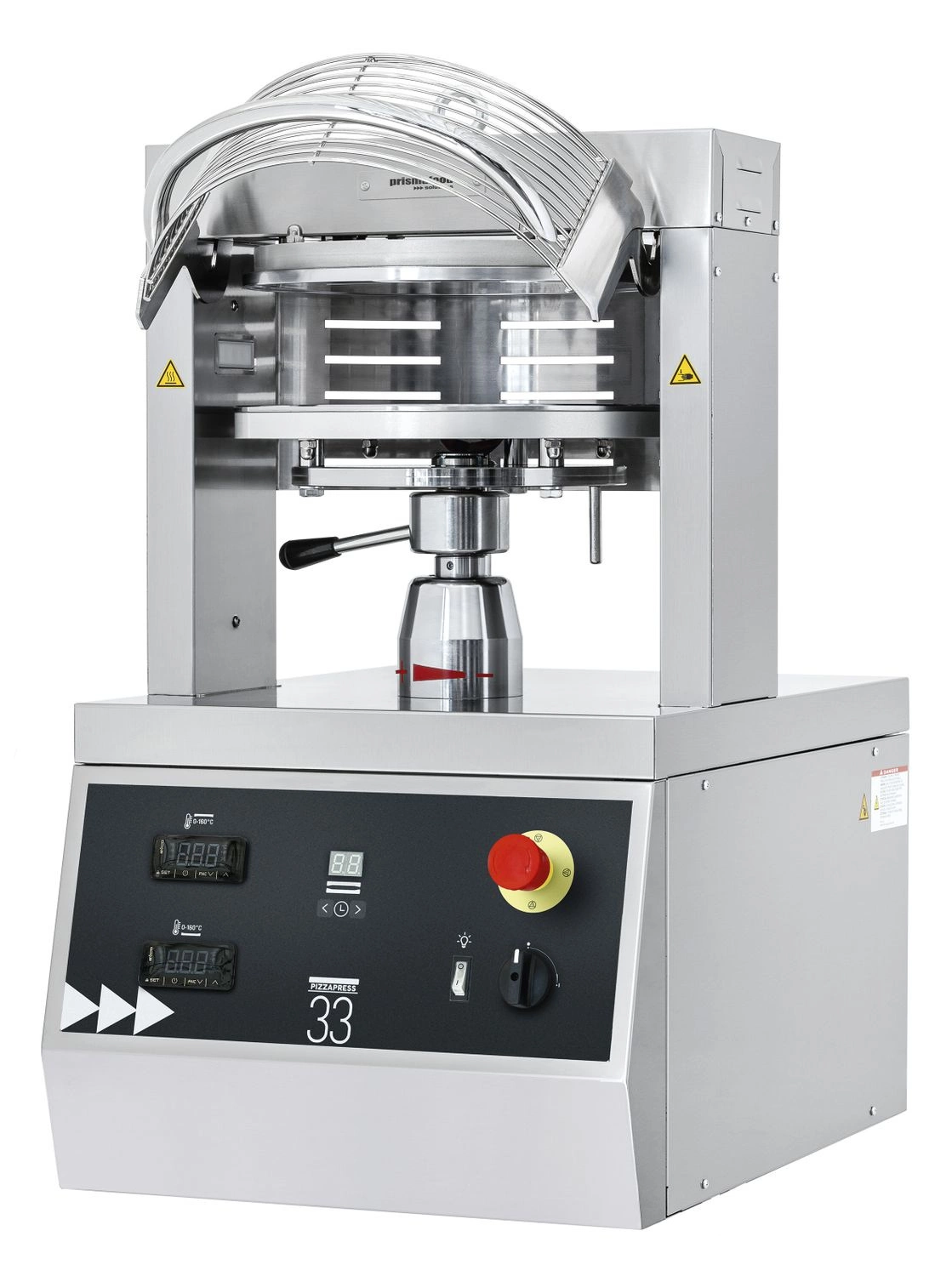 Lis na pizzu značky Prismafood, Určeno k válení těsta na pizzu o maximálním průměru 45 cm. Přístroj má nezávislé nastavení provozní teploty pro horní a spodní kotouče. Maximální hmotnost těsta před rozválením by měla být 600-650 gramů. Válcovací desky jsou vyrobeny z chromované oceli. Maximální vzdálenost mezi deskami je 110-115 mm. Nastavení tloušťky těsta pomocí páky. Pohyblivý kryt na přední straně stroje zajišťuje bezpečnost při práci se strojem. Spotřebič má také nastavitelnou dobu lisování těsta. Maximální teplota ohřevu desek je 170°C.