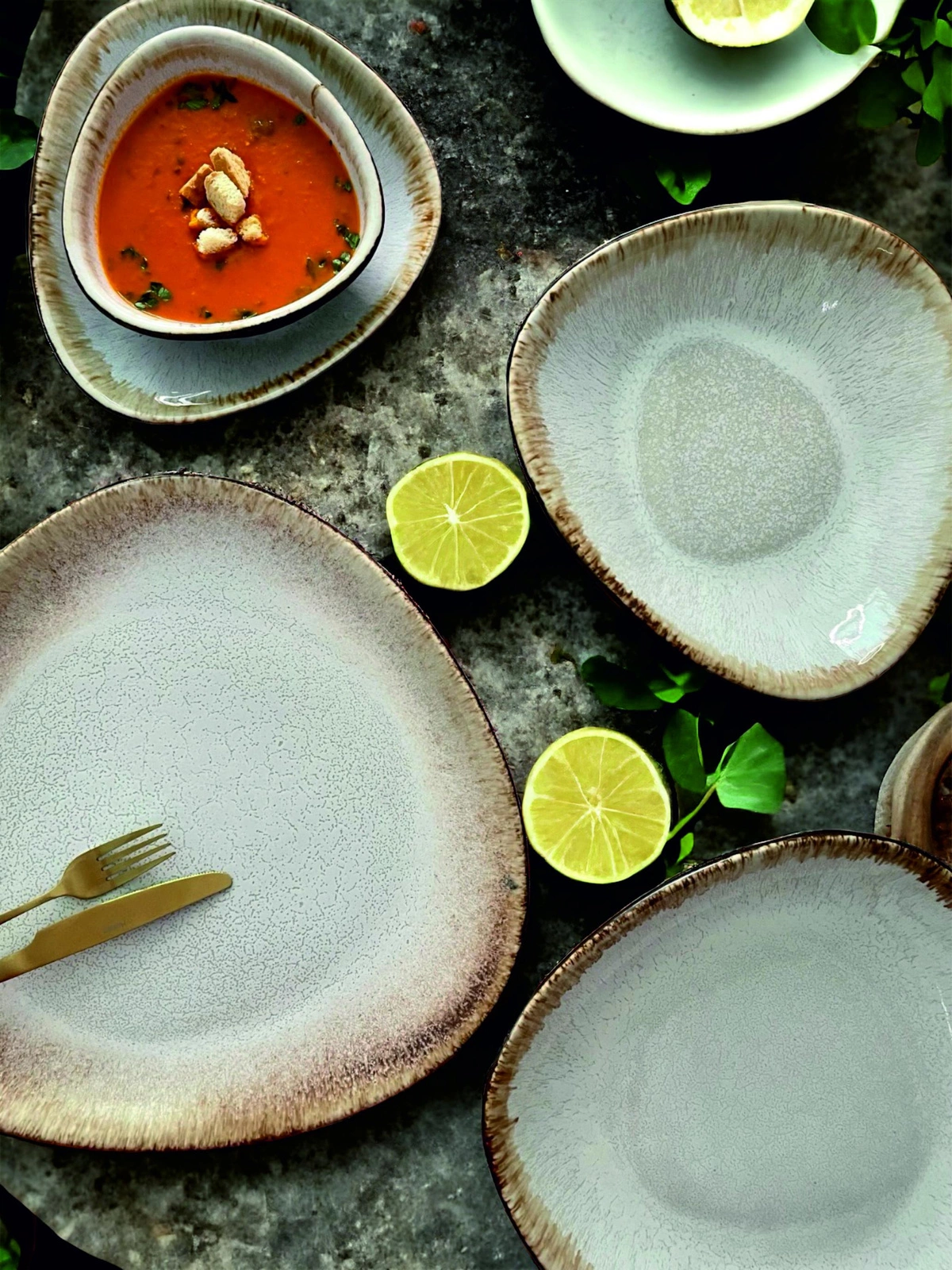 • Tvar: trojúhelníkový se zaoblenými rohy – dodává moderní charakter a vyniká mezi klasickými talíři.