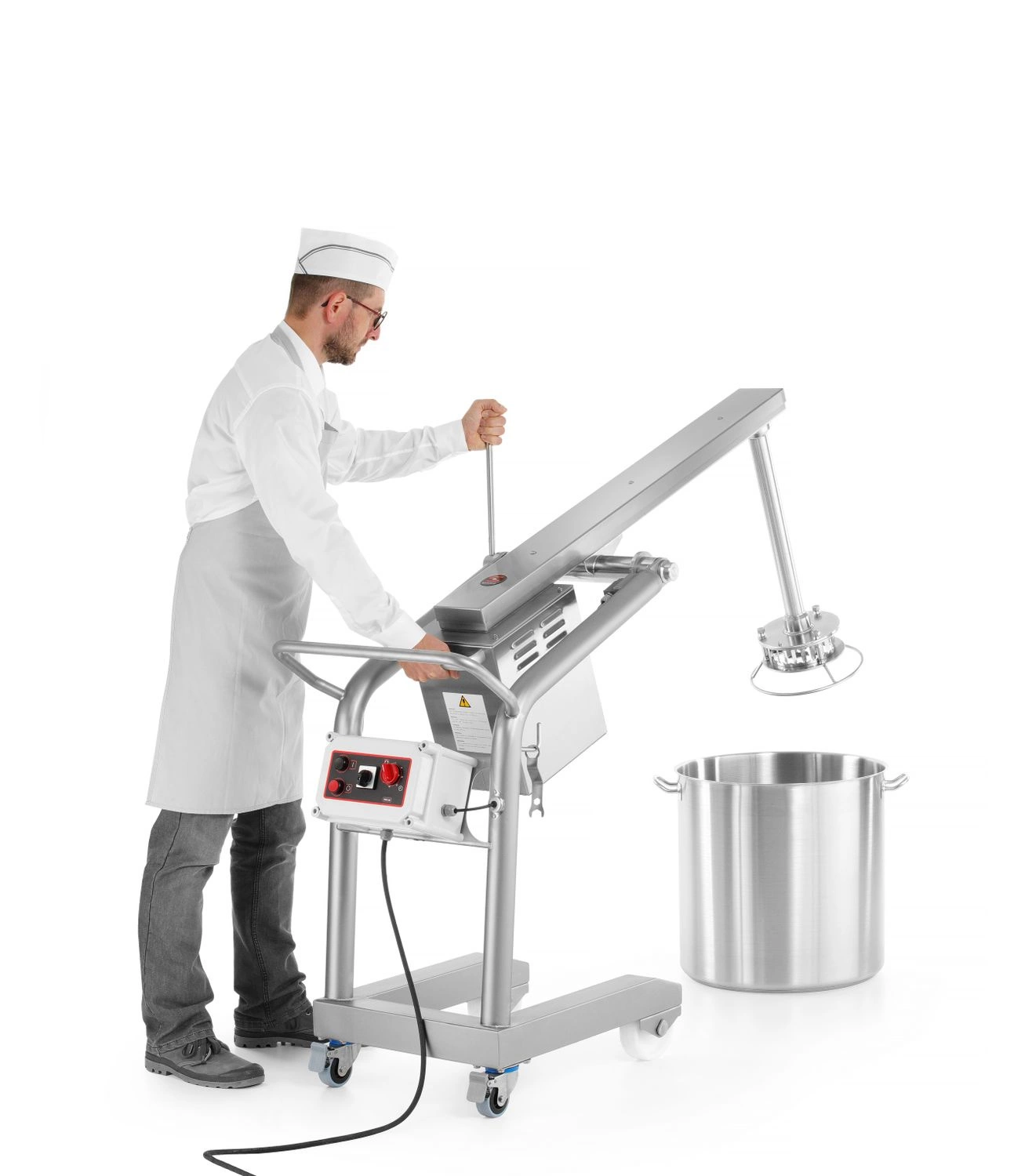 Ideální pro mixování potravin přímo ve vroucích hrncích. 60 cm dlouhé rameno účinně míchá v jakémkoli typu nádoby, kulaté nebo obdélníkové. Je vyrobeno výhradně z nerezové oceli 18/10. Rameno se může pohybovat v různých směrech a je výškově nastavitelné. Je upevněno na wózku se 4 protiskluzovými gumovými nožičkami, z nichž 2 jsou opatřeny brzdami.
