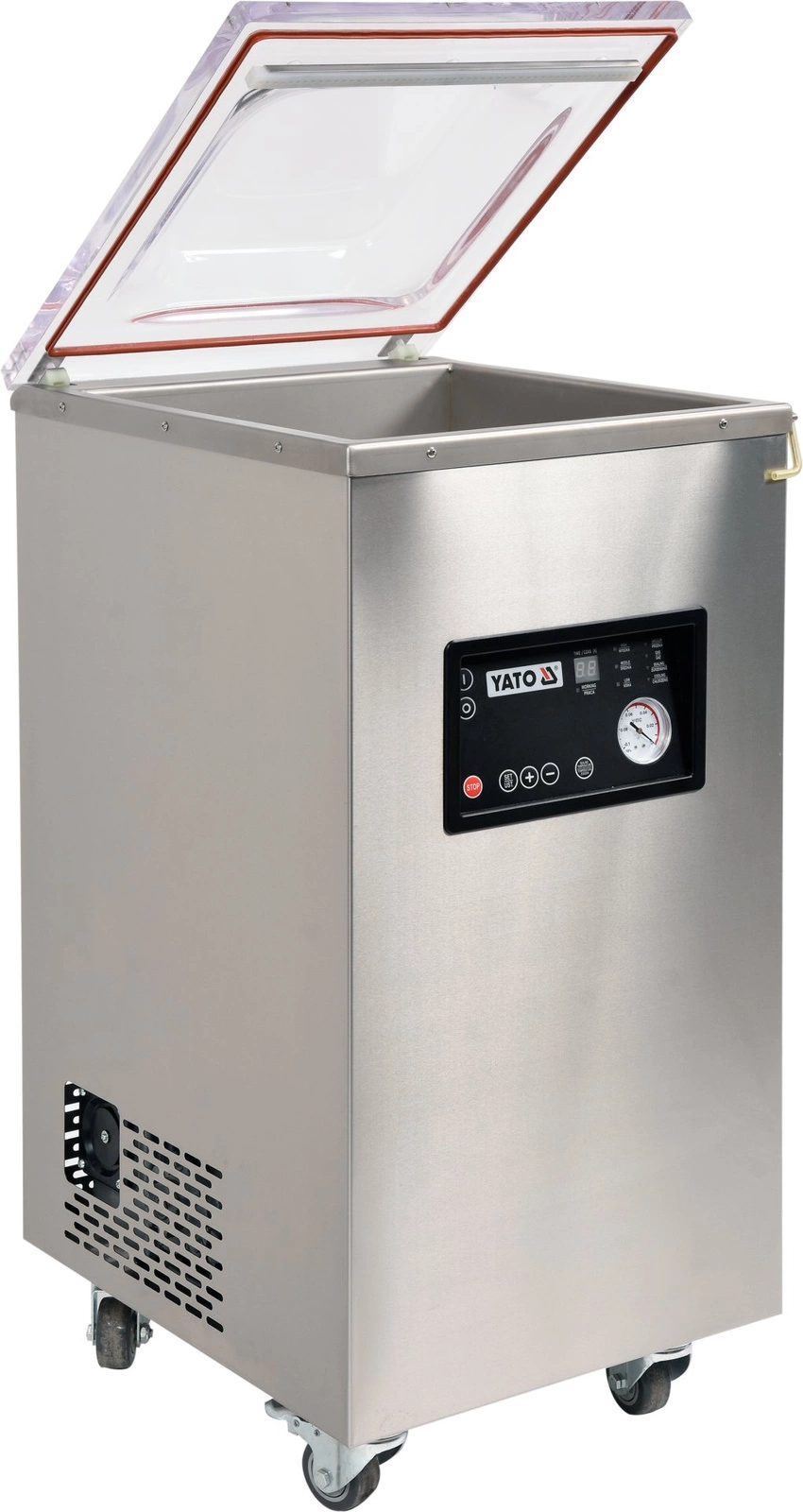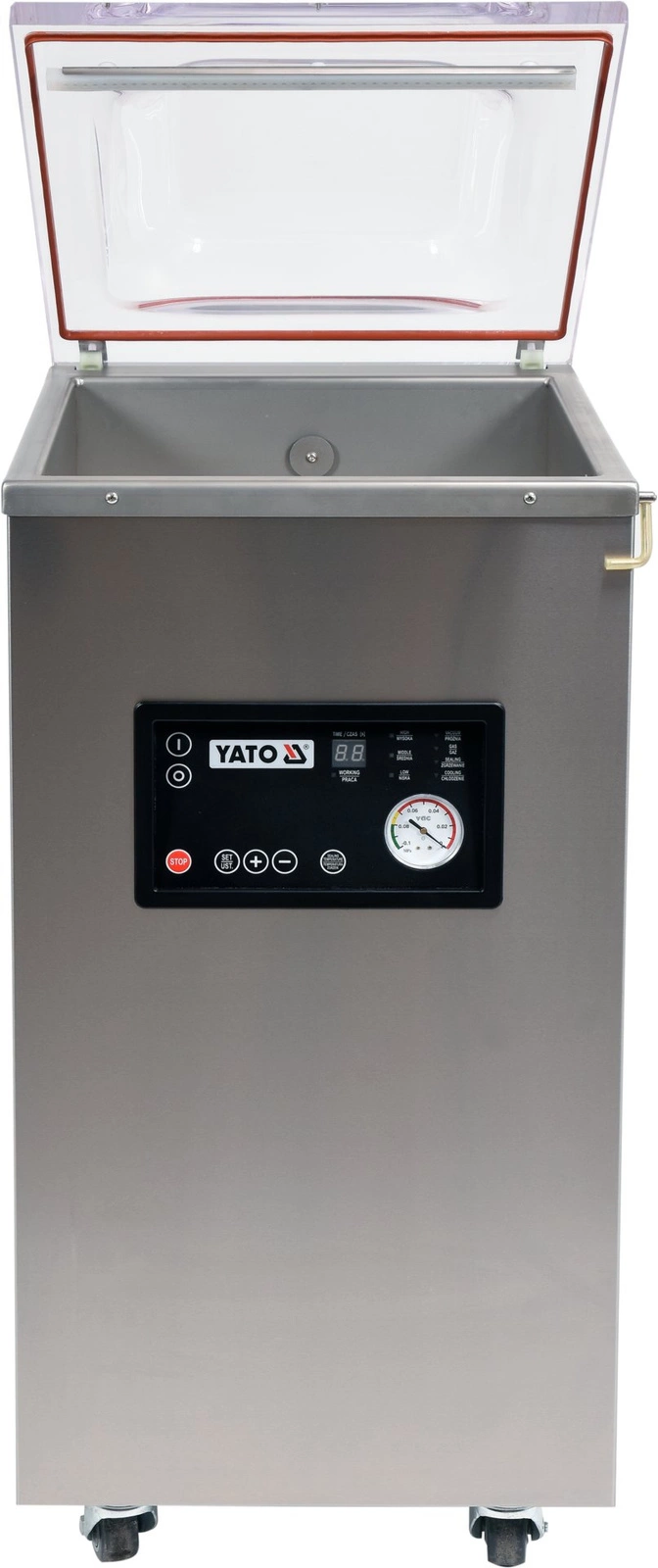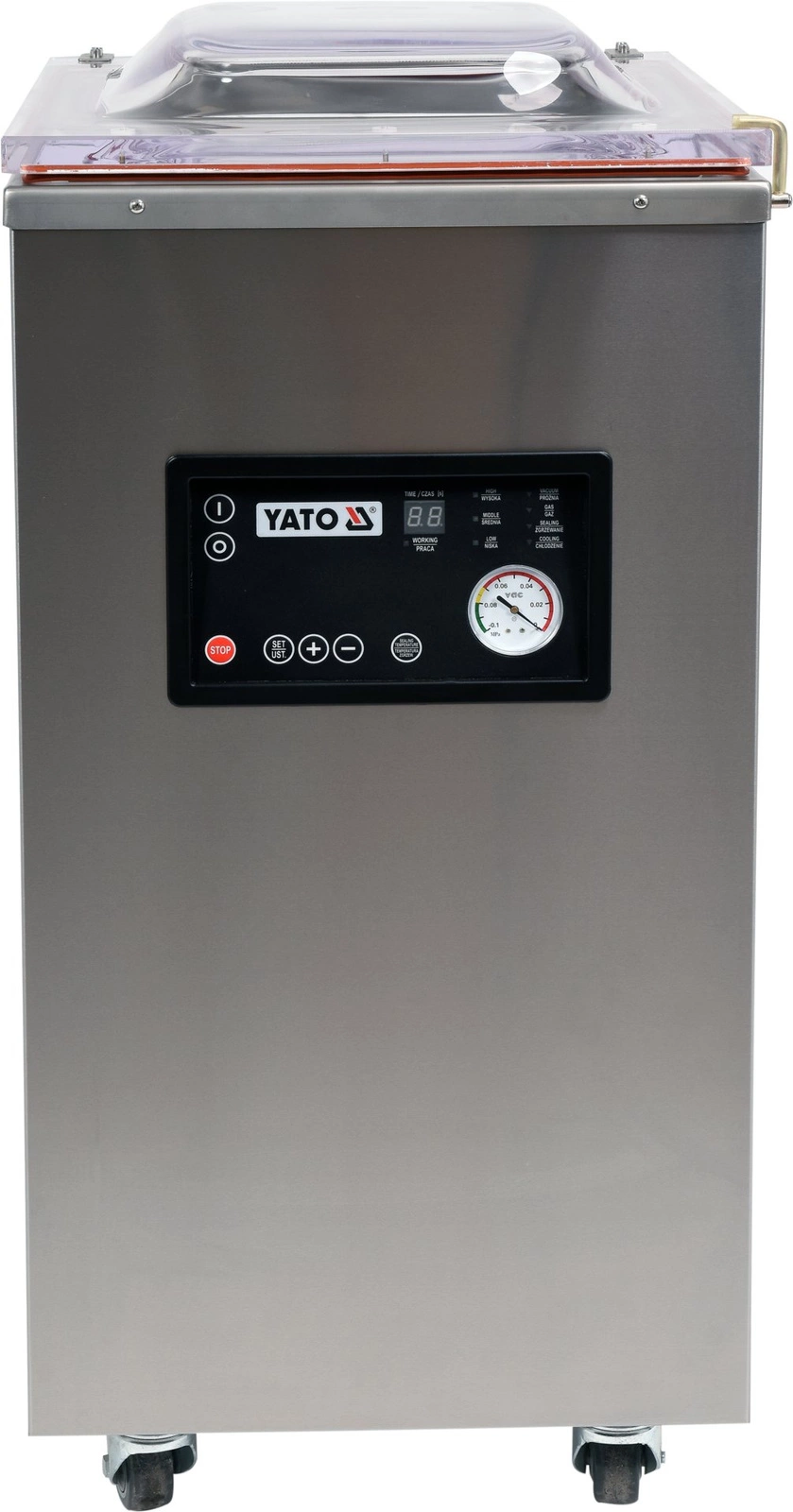 Mobilní jednokomorový mobilní balicí stroj YATO s šířkou těsnění 40 cm a vnější rozměry 55,5x47,5x107 cm. Kapacita jednotky je 230 l. Umožňuje balit potraviny v předbalených obalech, které účinně odolávají oxidačním a dezintegračním procesům a zaručují delší čerstvost. Konzervované výrobky lze dlouhodobě skladovat v chladničce s mrazničkou, čímž se minimalizuje množství odpadu a odpadá nutnost likvidace nespotřebovaných výrobkůóly. Primární obal je ideální pro marinování potravin, protože tím, že je potravina zbavena přístupu vzduchu, je proces marinování účinnější a chuť potravin intenzivnější. Přístroj je ideální pro přípravu sous vide, marinování potravin, skladování sezónního ovoceózeleniny a masa, chlazení a zmrazování nepoužitých výrobkůów.
