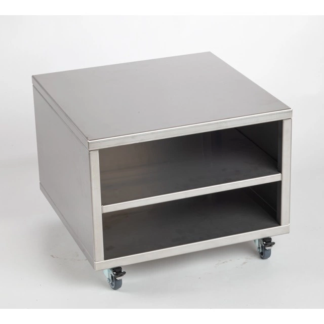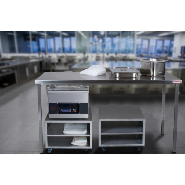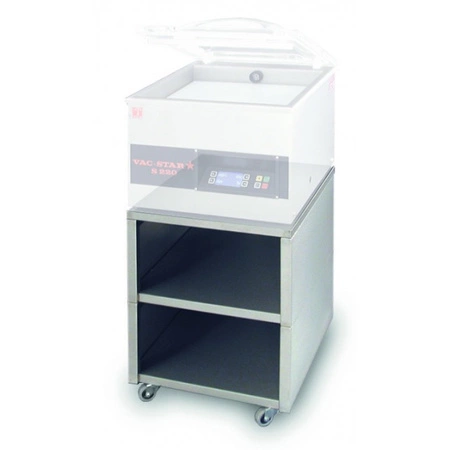 Základna je celá vyrobena z vysoce kvalitní nerezové oceli (CNS), která zaručuje trvanlivost, odolnost proti korozi a snadné čištění. Konstrukce je vybavena čtyřmi otočnými kolečky, z nichž dvě jsou opatřena brzdami, což umožňuje volný pohyb jednotky a její stabilitu během používání. Vestavěný úložný prostor poskytuje další prostor pro uložení příslušenství, jako jsou vakuové sáčky nebo nářadí.