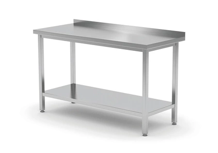 Nástěnný pracovní stůl s pó³. Vyrobeno z nerezové oceli AISI 430, šroubovaná konstrukce. Nastavitelné nohy ze čtvercových profilů. Zesílená základna a horní deska s ocelovým profilem. Výška zadního ráfku 4 cm.