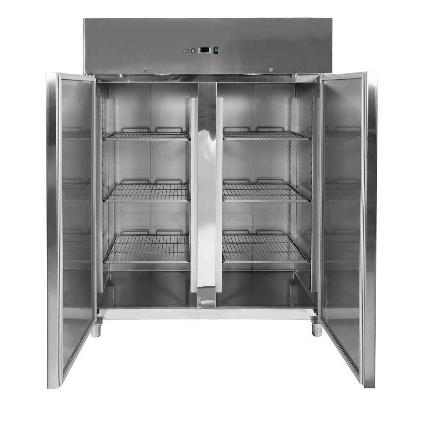 Nerezová chladicí skříň 2-dveřová značky YATO o objemu 1300l a rozměrech 148x83x201cm. Vnitřní a vnější plášť je vyroben z nerezové oceli ss201. Samozavírací dveře se zámkem a pohodlným madlem pro otevírání. Vybavení zahrnuje 6 polic roštových (po 3 na dveře) potažených PVC s nosností max 40 kg - při rovnoměrném zatížení. Možnost skladování nádob 2/1 GN. Komora je vybavena LED osvětlením. Horní chladicí agregát o výkonu 440 W využívá chladivo R290, je určený pro provoz ve 4. klimatické třídě - při maximální okolní teplotě 30C a relativní vlhkosti 55%. Zařízení je vybaveno elektronickým regulátorem značky Dixell s digitálním displejem teploty. Zařízení je umístěno na 4 nastavitelných nožkách 12–18 cm. Skříň je snadná na údržbu a čištění. Průměrná roční spotřeba energie 1590 kWh.