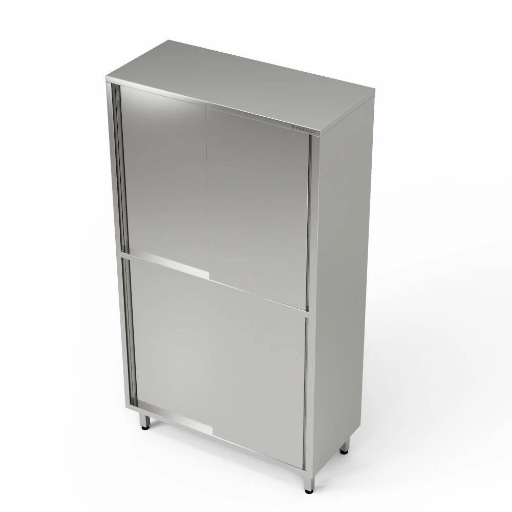 Horizontálně dělená úložná skříň o rozměrech 130x70x200 cm, vyrobený z nerezové oceli J4. Ve skříni jsou 2 lavice. Posuvné dveře.