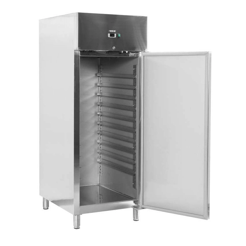 Mrazicí skříň pekařská 737 L YATO nerezová určená pro skladování pekařských plechů o rozměrech 60x80 cm. Objem 737 l. Vnitřní a vnější plášť je vyroben z nerezové oceli ss201. Samozavírací dveře se zámkem, vybavené pohodlnou rukojetí pro otevírání. Výměnné magnetické těsnění. Skříň je vybavena 10 úrovněmi vodítek přizpůsobených pro pekařské plechy 60x80 cm s nosností 40 kg – při rovnoměrném rozložení. Možnost 34stupňového nastavení výšky vodítek. Komora je vybavena LED osvětlením. Zařízení je umístěno na 4 nožkách s nastavitelnou výškou 14-20 cm. Horní chladicí agregát využívá chladivo R290, je určen pro provoz ve 4. klimatické třídě – při maximální okolní teplotě 30o C a relativní vlhkosti 55 %. Zařízení je vybaveno elektronickým ovladačem s digitálním displejem teploty.