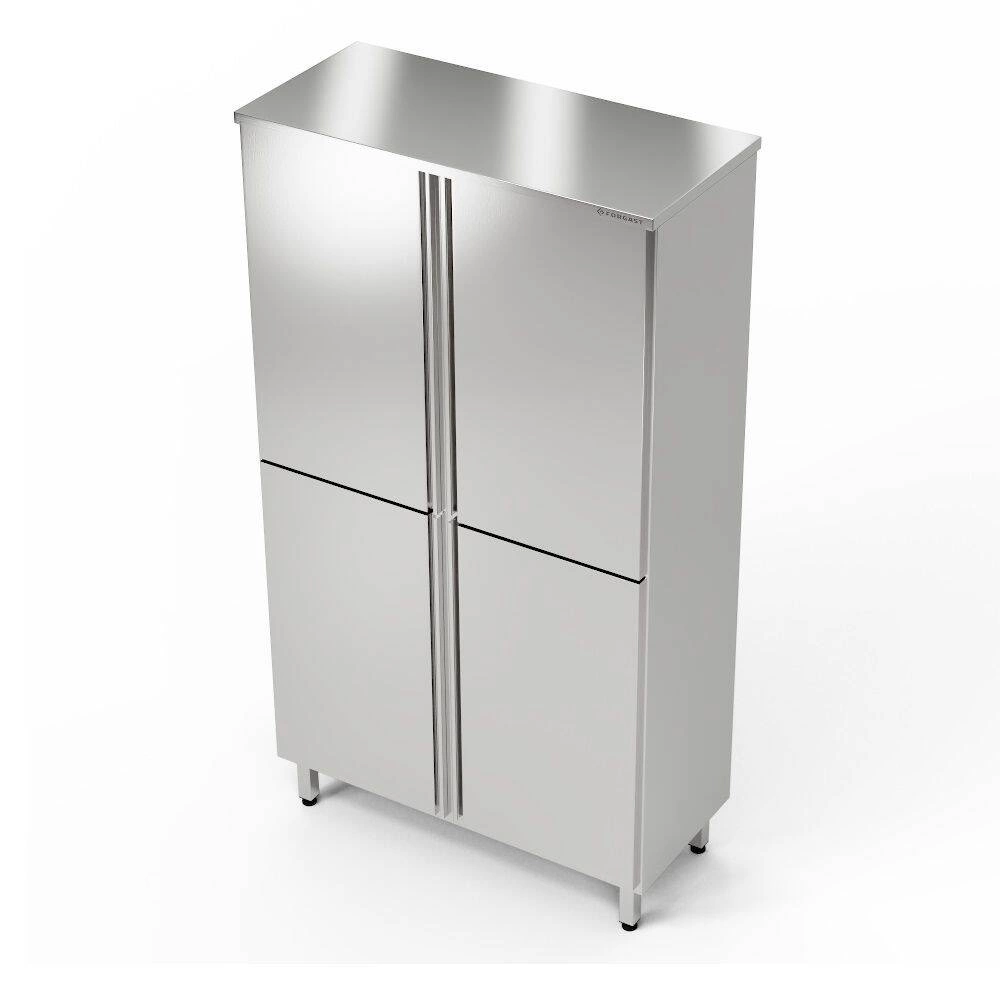 Průchozí dělená skříň o rozměrech 110x60x200 cm z nerezové oceli J4. V každé části skříně je 1 półka.