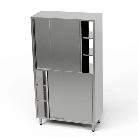 Průchozí dělená skříň o rozměrech 130x50x180 cm z nerezové oceli J4. Ve skříni jsou 2 pólavice. Posuvné dveře.
