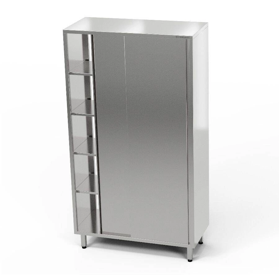 Průchozí šatní skříň o rozměrech 130x60x180 cm z nerezové oceli J4. Skříň má 4 pólavice. Posuvné dveře.