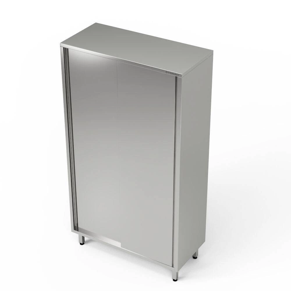 Průchozí šatní skříň o rozměrech 130x60x200 cm z nerezové oceli J4. Skříň má 2 pólavice. Posuvné dveře.