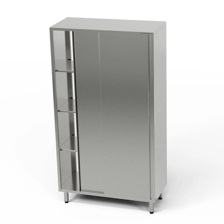 Průchozí šatní skříň o rozměrech 90x60x200 cm z nerezové oceli J4. Skříň má 3 pólavice. Posuvné dveře.
