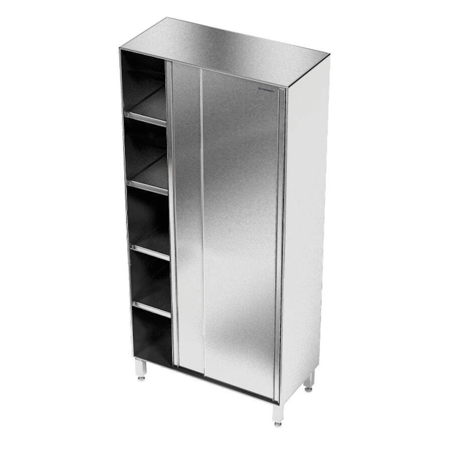 Úložná skříň o rozměrech 100x50x180 cm z nerezové oceli J4. Skříň má 4 pólavice.
