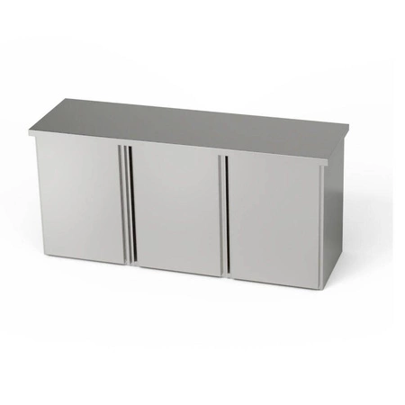 Závěsná skříňka s otevíracími dvířky s rozměry 130x30x60 cm. Vyrobeno z nerezové oceli J4. Tloušťka plechu 0,8 až 1 mm. Společná komora. Uvnitř skříně je jedna pólavička.