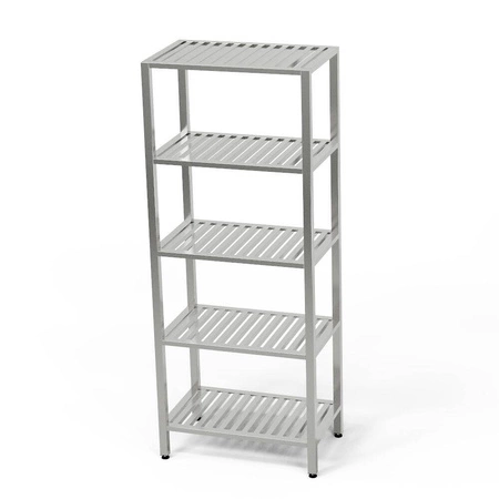 Konstrukce regálu je založena na uzavřených ocelových profilech, které zaručují vysokou stabilitu i při intenzivním zatížení. Pět prostorných roštových polic umožňuje pohodlnou organizaci jak drobných, tak větších předmětů. Otevřená forma polic usnadňuje čištění a minimalizuje riziko hromadění vlhkosti nebo nečistot. Sada obsahuje kompletní regál připravený k samostatné montáži včetně všech potřebných montážních prvků.