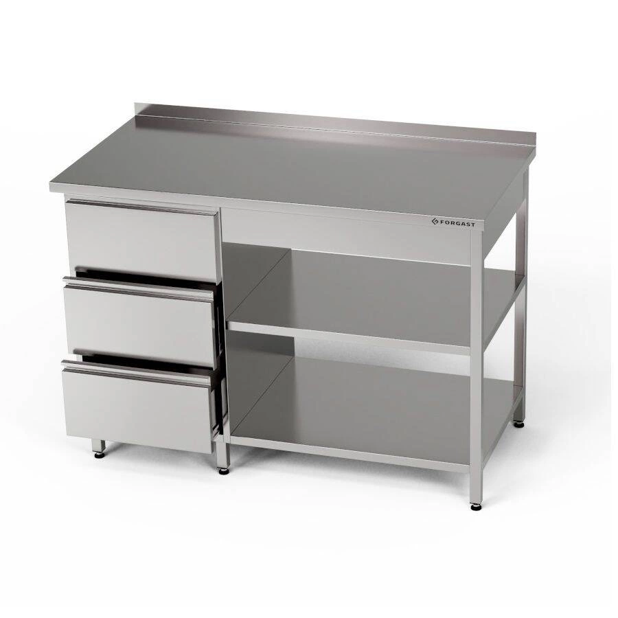 Nerezový pracovní stůl s blokem zásuvek a dvěma policemi 160x70x85 cm | FORGAST
