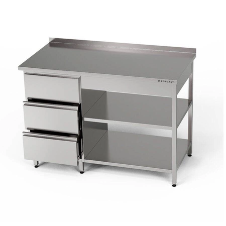 Nerezový pracovní stůl s blokem zásuvek a dvěma policemi 180x60x85 cm | FORGAST