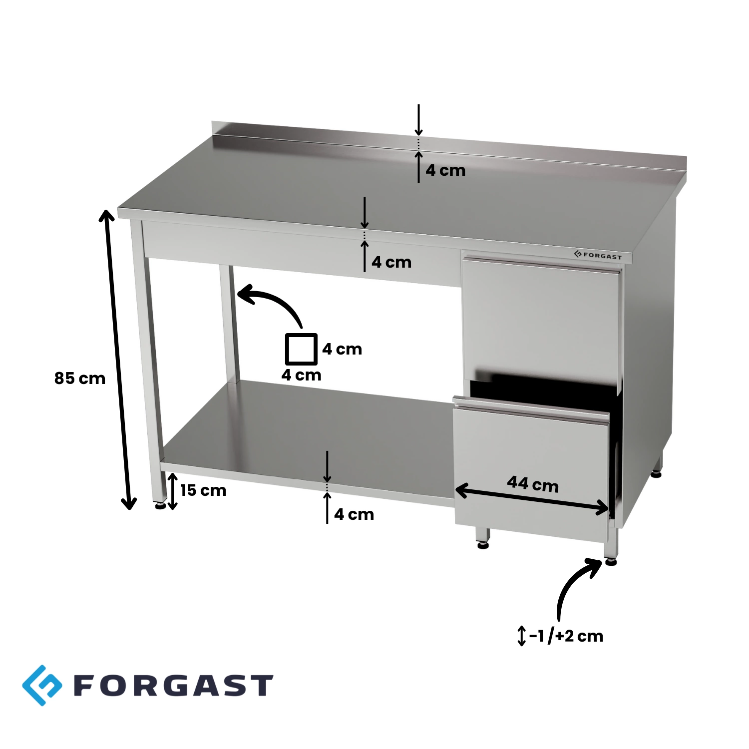 Stůl se standardně vyrábí se zadní hranou – dorazovou lištou vysokou přibližně 4 cm, která zabraňuje sklouznutí odpadu z pracovní plochy do mezery u stěny kuchyně. V závislosti na nastavení se doporučuje objednat pracovní stůl navíc s levým nebo pravým okrajem, aby se v kuchyni udržovala čistota.