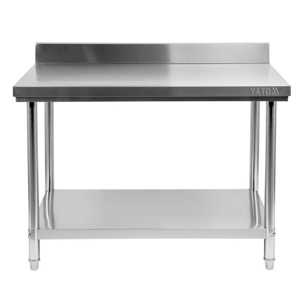 Nástěnný pracovní stůl s pracovní deskou o rozměrech 120x60x85 cm od společnosti YATO. Stupátko je vyrobeno z vysoce kvalitní nerezové oceli SS201, která zaručuje odolnost vůči intenzivnímu používání. Díky pečlivě opracovaným svařovaným spojům a hladkým povrchům je stůlóel nejen odolný, ale také se velmi snadno udržuje v čistotě, což je v profesionálních kuchyních zásadní. Deska stolu je vyrobena z robustního plechu o tloušťce 0,8 mm s přídavnými zpevňujícími profily. Kromě toho byla zespodu vyztužena dřevěnou laminovanou deskou o tloušťce 20 mm, díky čemuž je nejen tužší a zvukotěsná, ale také odolná vůči vlhkosti. Díky tomu vydrží stolová deska zatížení až 150 kg. Dodatečný 100 mm vysoký okraj v zadní části pracovní desky zabraňuje padání zbytků jídla za stůl, což zvyšuje hygienické standardy.